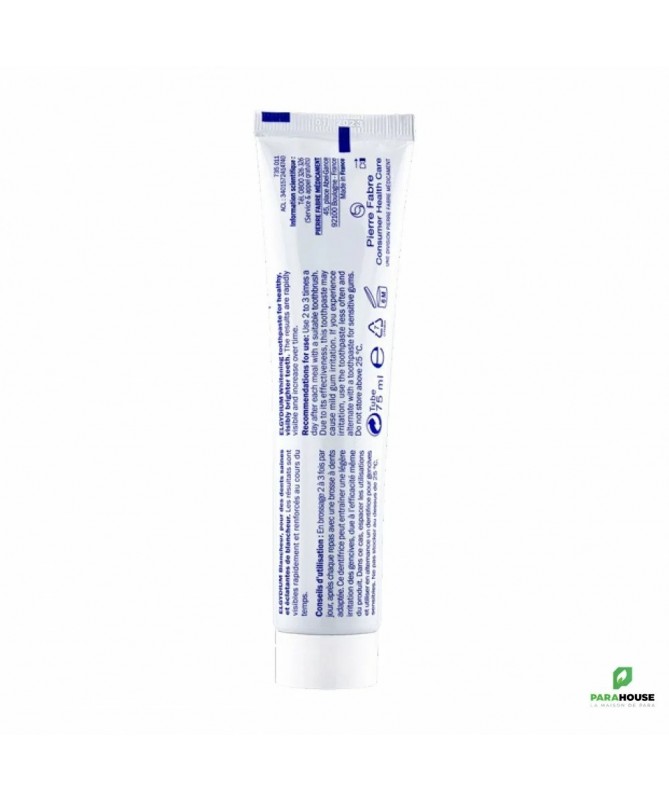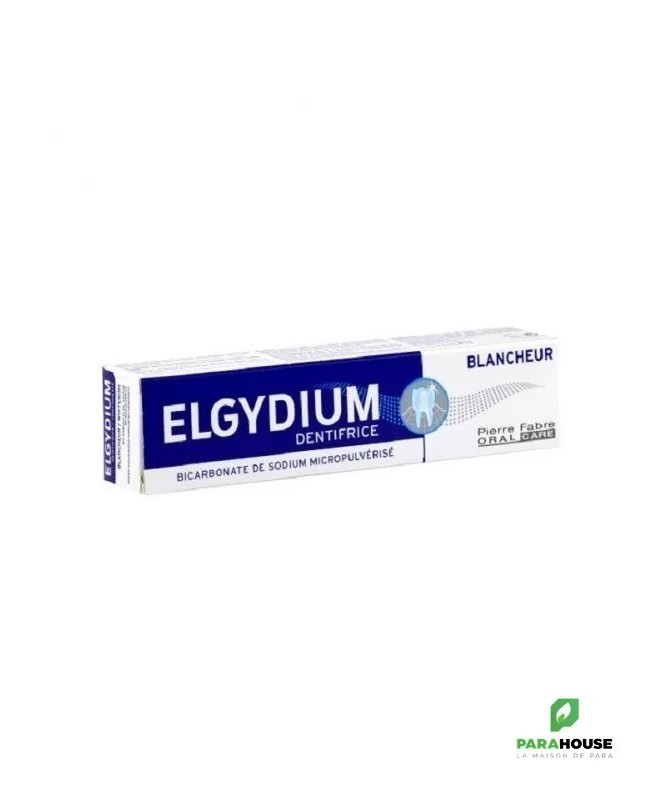 ELGYDIUM DENTIFRICE BLANCHEUR 75ML ELGYDIUM BLANCHEUR est un dentifrice qui contribue à éliminer les taches dentaires superficielles (dues notamment à l'alimentation ou au tabac) tout en respectant les dents. Aromatisé à la menthe, il prolonge la blancheur obtenue après un détartrage ou un éclaircissement professionnel. ELGYDIUM DENTIFRICE BLANCHEUR offre également une protection efficace contre les caries. Son effet, visible dès deux semaines sur les taches superficielles des dents, se renforce au fil du temps et des utilisations. Une efficacité rapide et durable a été perçue par 90% des sujets. Sa formule contient du Bicarbonate de sodium micropulvérisé, d’une taille en moyenne cinq fois plus petite que les cristaux classiques de Bicarbonate de sodium, pour pénétrer plus finement dans les sillons de l’émail. ELGYDIUM DENTIFRICE BLANCHEUR : MAINTIENT la blancheur naturelle des dents après deux semaines d’utilisation. PROLONGE la blancheur après un détartrage ou un éclaircissement professionnel. RESPECTE l’émail des dents. COMPOSITION : WATER (AQUA). GLYCERIN. HYDRATED SILICA. SODIUM BICARBONATE. SODIUM LAURYL SULFATE. FLAVOR (AROMA). TITANIUM DIOXIDE (CI 77891). TRIETHANOLAMINE. CELLULOSE GUM. CHLORHEXIDINE DIGLUCONATE. HYDROXYETHYLCELLULOSE. LIMONENE. SODIUM CARBONATE. SODIUM SACCHARIN Conseils d'Utilisation: En brossage de 2 à 3 minutes, 2 à 3 fois par jour, après chaque repas, avec une brosse adaptée, par exemple la brosse ELGYDIUM Blancheur dotée du Microball System.
