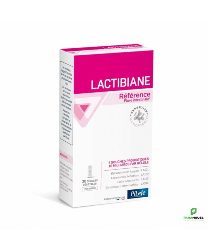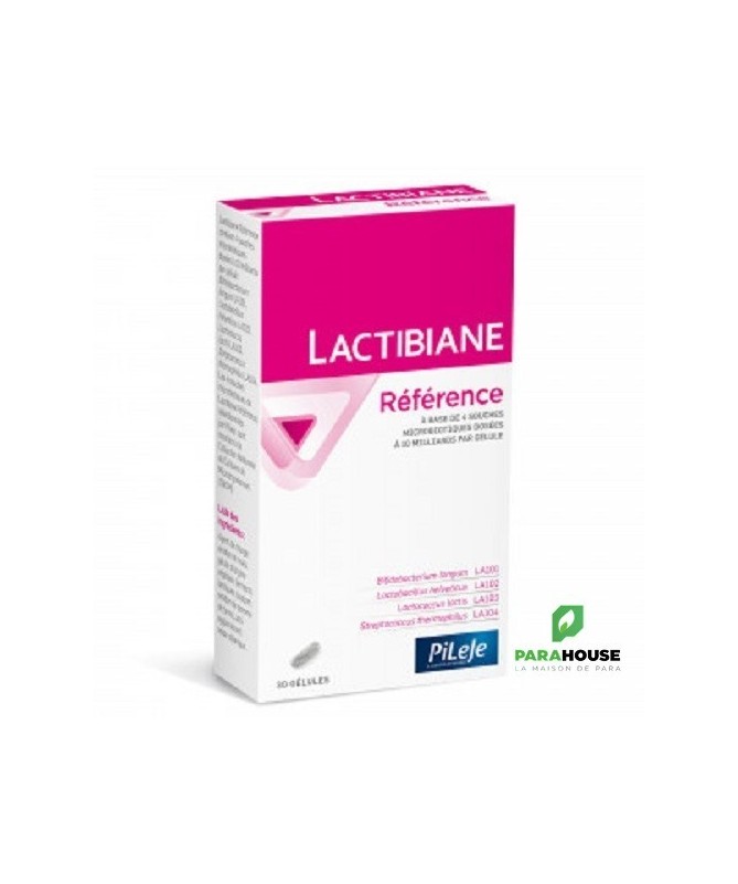 PILEJE Lactibiane Reference 30 Gelules PILEJE Lactibiane Reference est un complément alimentaire à base de 4 souches probiotiques dosées à 10 milliards par gelule. Plus de 10 000 milliards de bactéries sont présentes dans la flore intestinale à l'âge adulte . Si un tiers des bactéries est commun entre les individus, chaque personne possède une identité propre au niveau de sa flore intestinale. Pour favoriser l’équilibre de la flore intestinale, et y maintenir une richesse et une diversité de bactéries , il est nécessaire d’adopter une alimentation source : de prébiotiques , qui sont des fibres alimentaires dont se nourrissent les bactéries. Il s’agit principalement d’aliments riches en fibres tels que les poireaux, céréales complètes, artichauts, oléagineux ou encore les aliments riches en acides gras essentiels tels que les huiles végétales (colza, noix) ou les poissons gras de probiotiques : laits et légumes fermentés, kéfir, dérivés du soja tels que miso, tempeh… Un apport de compléments alimentaires à base de souches probiotiques spécifiques et individualisées est également intéressant car ces micro-organismes vivants contribuent à l’équilibre de la flore intestinale. Pionniers dans l'étude des microbiotes depuis 1991, le laboratoire PiLeJe sélectionne de manière rigoureuse les souches probiotiques présentes dans ses compléments alimentaires. Une attention particulière est apportée à la viabilité et à la stabilité des souches sélectionnées, depuis l’étape initiale de leur sélection jusqu’à l’élaboration des produits finis, afin de proposer à chacun des solutions adaptées, uniques et de haute qualité . La recherche PiLeJe a ainsi développé Lactibiane Référence , complément alimentaire contenant 4 souches probiotiques dosées à 10 milliards par gélule : Bifidobacterium longum LA101 Lactobacillus helveticus LA102 Lactococcus lactis LA103 Streptococcus thermophilus LA104 Composition : Streptococcus thermophilus LA104, Lactobacillus helveticus LA102, Lactobacillus lactis LA103, Bifidobacterium longum LA101 Conseils d'utilisation : 1 gélule de Lactibiane Reference par jour à avaler avec un grand verre d'eau. À prendre avant un repas. Conservation : dans un endroit frais et sec. Ne pas dépasser les doses journalières recommandées. Ce complément alimentaire ne peut se substituer à une alimentation variée, équilibrée et à un mode de vie sain. À tenir hors de portée des enfants. À consommer de préférence avant fin et n° de lot mentionnés sur la face inférieure de l'étui.