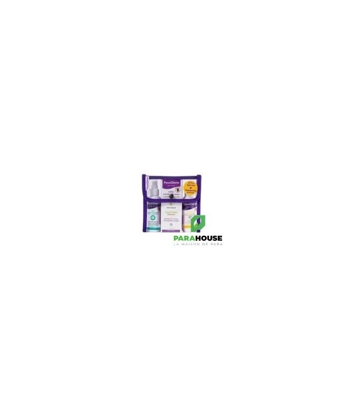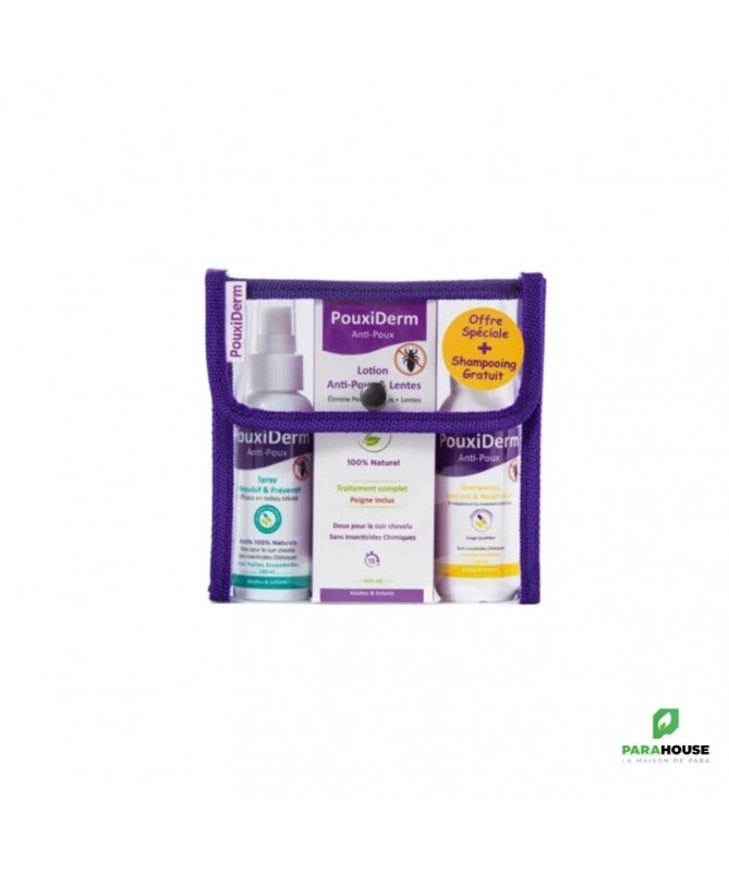 DESCRIPTION :PouxiDerm Lotion Anti-Poux 100MLPouxiderm Lotion Anti-Poux 100% naturelle, sans insecticide, sans conservateur et sans parfum de synthèse. Grâce à la combinaison de ses 4 Huiles Essentielles et ses 5 Huiles Végétales connues pour leur action Anti-poux, PouxiDerm Lotion élimine les poux, lentes et larves et aide à calmer les démangeaisons. Sa formule douce laisse les cheveux lisses et brillants.POUXIDERM SHAMPOING ANTI POUX 125ML-INODERMAPouxiDerm shampoing apaisant assainissant est un soin en complément du traitement anti-poux .ce shampoing s'utilise au quotidien pour aider a éliminer les lentes et les poux morts. Grâce a sa formule sans insecticides chimique et riche en huiles essentielles , PouxiDerm shampoing assainit et apaise le cuir chevelu sans laisser de résidus grasPouxiDerm Spray Anti-Poux Répulsif & Préventif 100MLPouxiderm Spray Anti-poux Répulsif et Préventif pour adultes et enfants. Sa formule 100% naturelle, sans insecticides et sans alcool, assure une protection contre les poux en cas d’épidémie sans abîmer le cuir chevelu.