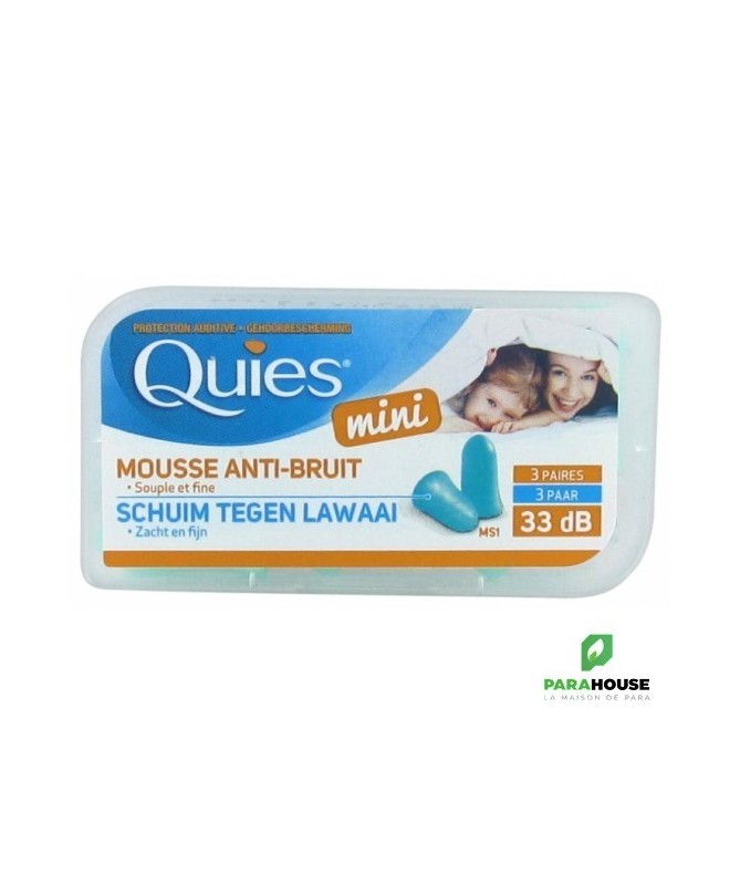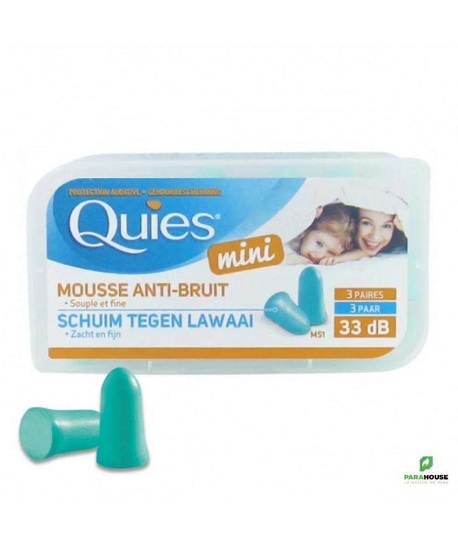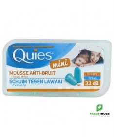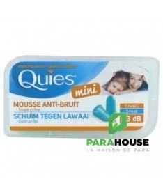 QUIES Mini Mousse Anti-Bruit 3 Paires QUIES Mini Mousse Anti Bruit sont des protections auditives en mousse adaptées aux conduits auditifs petits. Elles ont pour rôle d'atténuer le bruit environnant fort de 33dB. QUIES Mini sont des protections auditives à base de mousse sont douces et souples st se maintiennent parfaitement à l'oreille et Conviennent aux enfants dès 4 ans. Composition : Mousse de polyuréthane. Conseils d'utilisation : Il est conseillé de : Avec des mains propres, rouler le bouchons pour le rndre fin. Insérer doucement le bouchon dans le conduit auditif. Tirer le lobe de l’oreille vers l’arrière pour chasser l’air. Maintenir le bouchon jusqu’à ce qu’il se gonfle et soit maintenu à l’intérieur du conduit auditif. NB : Usage unique.