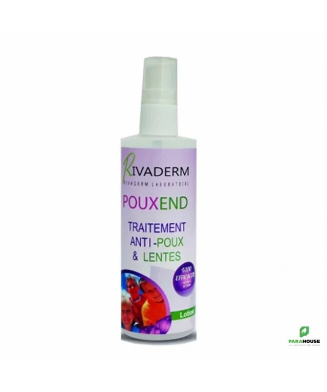 RIVADERM POUXEND LOTION 100ML Pouxend lotion à base diméticone et sans insecticide est à haute efficacité prouvée par des études cliniques. Pouxned lotion est le premier des traitements anti-poux, son action physique est douce sur les cheveux et la peau, avec une formule non grasse Pouxned lotion est indiqué pour les adultes et les enfants à partir de 6 mois. Conseils d'utilisation : Appliquer la lotion Pouxend sur le cuir chevelu et les cheveux secs Masser les cheveux afin d'obtenir une imprégnation complète de la chevelure Laisser Pouxend lotion agir pendant 25 minutes. Laver les cheveux avec pouxend shampooing en peignant puis rincer à l'eau.