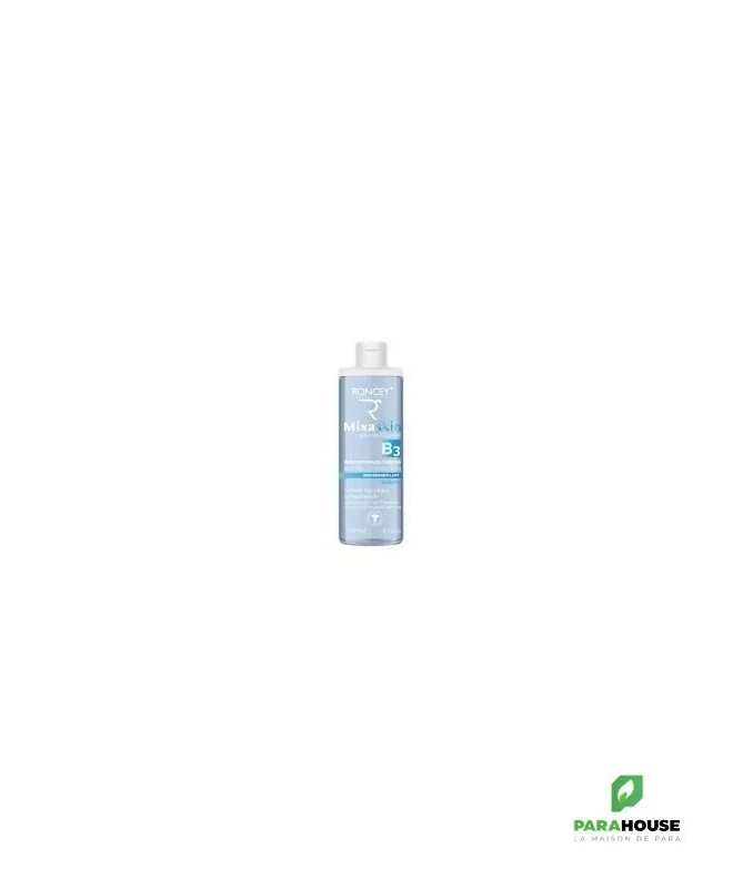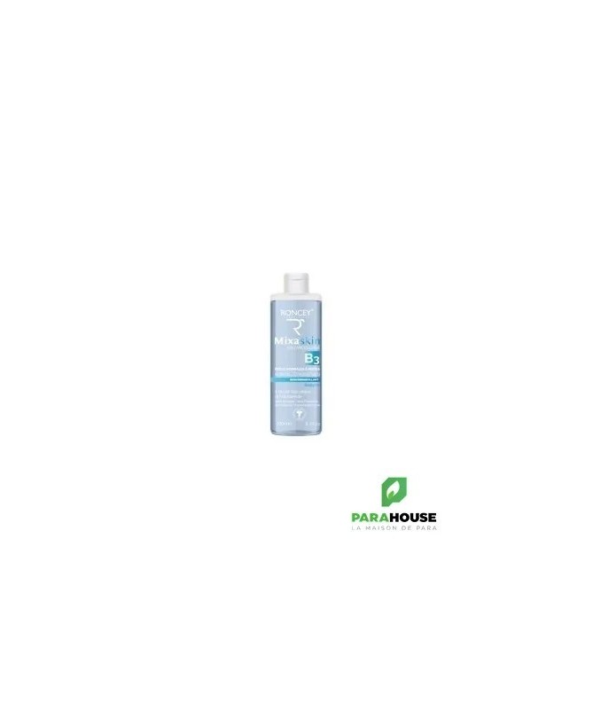 Eau micellaire peaux normales à mixtes - Roncey Mixaskin - 250ml L’Eau Micellaire Mixaskin convient aux peaux normales à mixtes, nettoie en douceur et élimine efficacement le maquillage et les impuretés de la peau. De plus, elle purifie et hydrate la peau et normalise la quantité de sébum. Grâce à sa composition spéciale, cette Eau Micellaire offre un soin parfait tout en nettoyant efficacement la peau. La Niacinnamide (Vitamine B3) stimule donc le renouvellement cellulaire qui lui-même permet d'avoir une peau plus lisse, plus ferme, et plus lumineuse. L’acide salicylique exerce une action kératolytique, c’est-à-dire qu’il élimine en douceur les cellules mortes, favorise le renouvellement cellulaire et affine le grain de peau. Biosaccharide gum-1 est un actif hydratant, il permet de stimuler le renouvellement cellulaire. Il dispose aussi d'une activité anti-âge intéressante si bien qu'on le compare souvent à l'acide hyaluronique. Proprétés : Sans Rinçage Sans Paraben Sans Alcool Hypoallergénique Indication : Cette eau micellaire est spécialement conçue pour une peau normale à mixte.