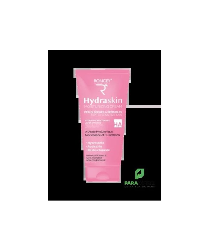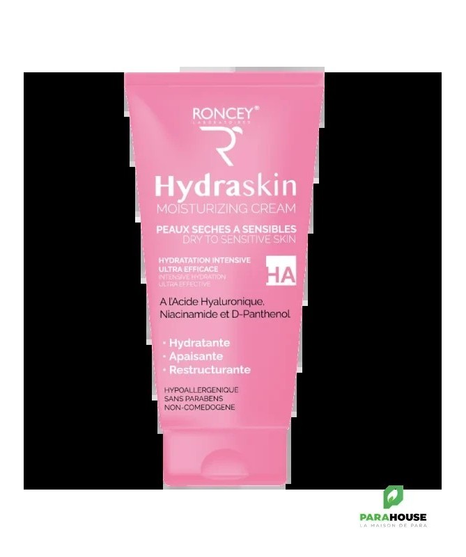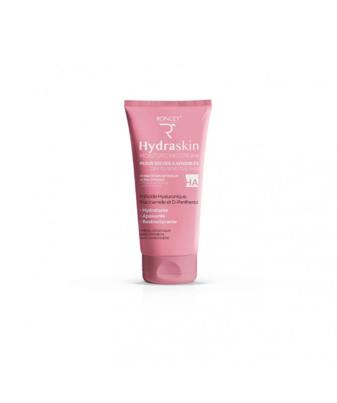 RONCEY Crème Hydratante HydraSkin pour Peau Sèche et Sensible 50mlIndications : Efficace sur les peaux sèches et sensibles.Innovation : Dès la première application, cette crème procure à la peau une douceur telle que l’utilisateur se retrouve instantanément dans une sensation de confort. Elle génère également un effet apaisant sur l’épiderme réduisant ainsi les possibilités d’irritations et de démangeaisons cutanées. Efficace sur les peaux sèches et sensibles. Formulé avec un complexe riche en actifs puissants complémentaires ultra concentrés :- L’Acide Hyaluronique : joue un rôle majeur dans le maintien du niveau d’hydratation de la peau. Il est également utilisé pour ses propriétés raffermissantes, anti-rides, régénérantes, redensifiantes.- Niacinamide (Vitamine B3) : stimule la production de collagène. Elle agit comme un antioxydant et contribue ainsi à réparer la peau des dommages des UV en ralentissant l'oxydation des cellules épidermiques qui, attaquées par les radicaux libres, déclenchent un vieillissement prématuré de la peau.- Aquaxyl (Xylitylglucoside, Anhydroxylitol, Xylitol) : reconnu par son action 3D en hydratation : Améliore la circulation de l’eau dans toutes les couches de la peau, stimule la production d’acide hyaluronique et maintien l’hydratation de la peau pendant 24 heures. Cet actif donne une peau adoucie avec des ridules atténuées en 28 jours.- Biosaccharide gum-1 : possède des propriétés apaisantes, hydratantes, anti-âge, restructurantes et améliore le toucher.- Panthenol (Provitamine B5) : participe activement à la formation et à la régénération de la peau. Elle posséde des propriètés cicatrisantes, réparatrices, apaisantes, hydratantes et anti-inflammatoires.- Allantoïne : est un actif cosmétique connu pour ses propriétés régénérantes et cicatrisantes. Elle est Hydratante et maintient le film hydrolipidique cutané et rend la peau souple et douce. Également apaisante et anti-inflammatoire, elle est idéale pour lutter contre les irritations cutanées.- L’Extrait de Camomille et L’Extrait de Calendula : soulagent la douleur grâce à leurs propriétés anti-inflammatoires et antibactériennes. Ils aident à la cicatrisation et stimulent la régénération de la peau endommagée ou irritée