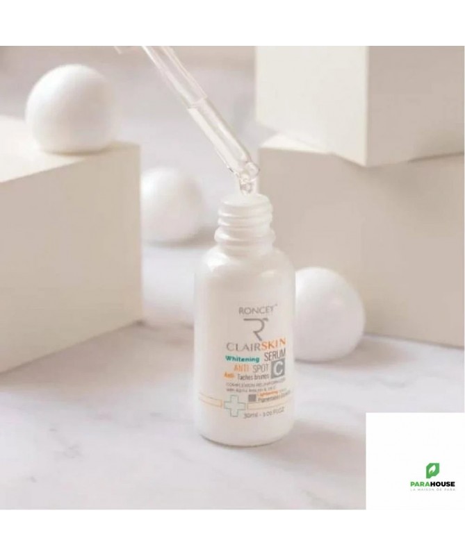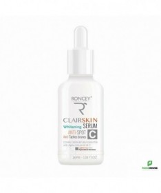 RONCEY CLAIRSKIN SERUM ECLAIRCISSANT ANTI TACHES 30ML RONCEY CLAIRSKIN SERUM ECLAIRCISSANT ANTI TACHES est un traitement intensif qui cible visiblement les taches brunes et l'hyperpigmentation. Formulé avec de la Vitamine C pure et de l'Alpha Arbutin, ce sérum correcteur unifie le teint, estompe les imperfections pigmentaires et prévient leur réapparition. Cette formule hautement concentrée agit en profondeur sur le mécanisme de la mélanine pour corriger les taches existantes et prévenir la formation de nouvelles imperfections pigmentaires. Les bienfaits du Sérum Clairskin En optant pour ce sérum éclaircissant, vous choisissez une solution aux multiples bénéfices : Action Anti-Tâches Intensive : L'Alpha Arbutin et la Vitamine C agissent en synergie pour réduire visiblement les taches brunes Teint Uniforme et Lumineux : Unifie la pigmentation cutanée pour un résultat naturellement éclatant Prévention Active : Empêche la formation de nouvelles taches pigmentaires Formule Sûre et Respectueuse : Hypoallergénique, sans parabènes et non comédogène Spécialement conçu pour : Les peaux présentant des taches brunes liées au soleil ou à l'âge Les teints irréguliers avec hyperpigmentation diffuse Les marques post-inflammatoires suite à des imperfections Les peaux ternes manquant d'éclat et d'uniformité Composition : AQUA/ WATER, PROPANEDIOL, GLYCERIN, ETHYL ASCORBIC ACID (VITAMIN C), ALPHA ARBUTIN, PROPYLENE GLYCOL, PANTHENOL (VITAMIN B5), IMIDAZOLIDINYL UREA, SODIUM ACETYLATED HYALURONATE (HYALURONIC ACID), XANTHANE GUM, HYDROXYPROPYL METHYLCELLULOSE, SODIUM BENZOATE, FRAGRANCE. HYPOALLERGENIQUE SANS PARABENS NON-COMEDOGENE Conseils d'utilisation : Ce sérum anti tachesnpeut être utilisé de manière quotidienne. Une application prolongée sur une durée d’au moins 4 semaines, permet d’optimiser les effets du sérum. Appliquer le matin et le soir sur l’ensemble du visage. Absorption rapide. Fini non collant. Non comédogène.