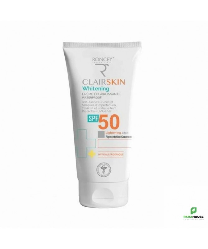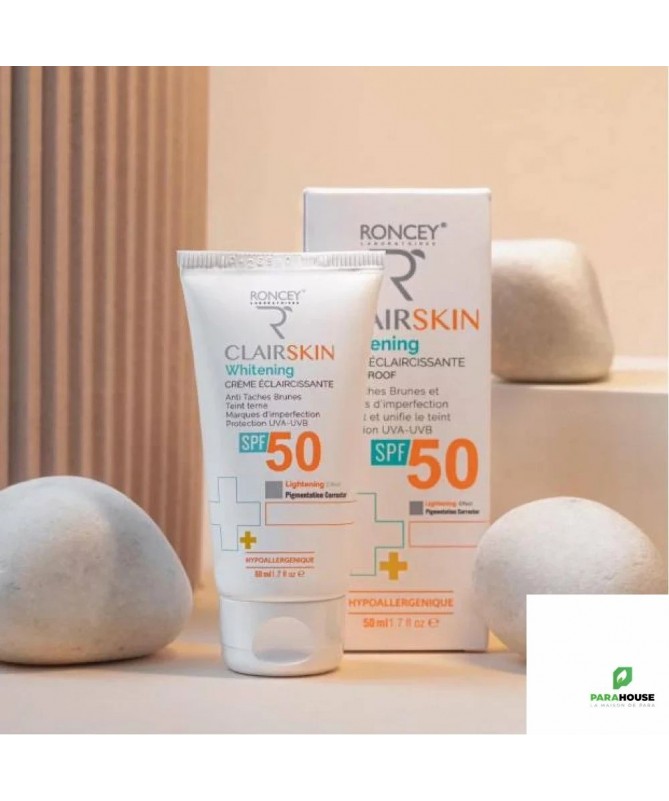 RONCEY CLAIRSKIN CREME ECLAIRCISSANTE SPF50 50ML RONCEY CLAIRSKIN CREME ECLAIRCISSANTE SPF50 allie action éclaircissante contre les taches brunes et protection solaire très haute. Formulée à la Vitamine C stabilisée et à la Niacinamide, cette crème visage unifie le teint, estompe les marques d'imperfections et prévient le vieillissement cutané. Une hydratation 24h et une protection optimale dans un seul geste beauté. Les bienfaits de la Crème Clairskin SPF50 En choisissant cette crème éclaircissante, vous optez pour une solution multi-bénéfiques : Action Anti-Tâches Ciblée : La Vitamine C stabilisée et la Niacinamide estompent visiblement les taches brunes et les marques d'imperfections. Protection Solaire Très Haute : Le SPF50 protège contre les UVA/UVB et prévient l'apparition de nouvelles taches pigmentaires. Teint Uniforme et Lumineux : Unifie le teint et réduit les irrégularités pigmentaires pour un résultat éclatant. Hydratation 24H Intensive : Formule hydratante qui maintient le confort de la peau toute la journée. Idéal pour les peaux présentant : Des taches brunes liées au soleil ou à l'âge Des marques post-inflammatoires suite à des imperfections Un teint hétérogène avec des irrégularités pigmentaires Une sensibilité au soleil nécessitant une protection élevée Composition : Aqua, Butyl Methoxydibenzoylmethane, Octocrylene, Stearic Acid, Ascorbyl Glucoside, Glycerin, Niacinnamide, Triethanolamine, Dimethicone, Acrylates/Acrylamide Copolymer, Cetearyl Alcohol, Isopropyl Myristate, Tocopheryl Acetate, Ethyl Hexyl Methoxycinnamate, Salycilic Acid, PEG-40 Hydrogenated Castor Oil, Silica, Potassium Sorbate, Sodium Benzoate, Titanium Dioxyde, Fragrance. Conseils d'utilisation : Appliquez la crème visage éclaircissante Clairskin SPF50 au moins 2 fois par jour en massant délicatement sur le visage préalablement nettoyé et séché. Évitez le contact avec les yeux.