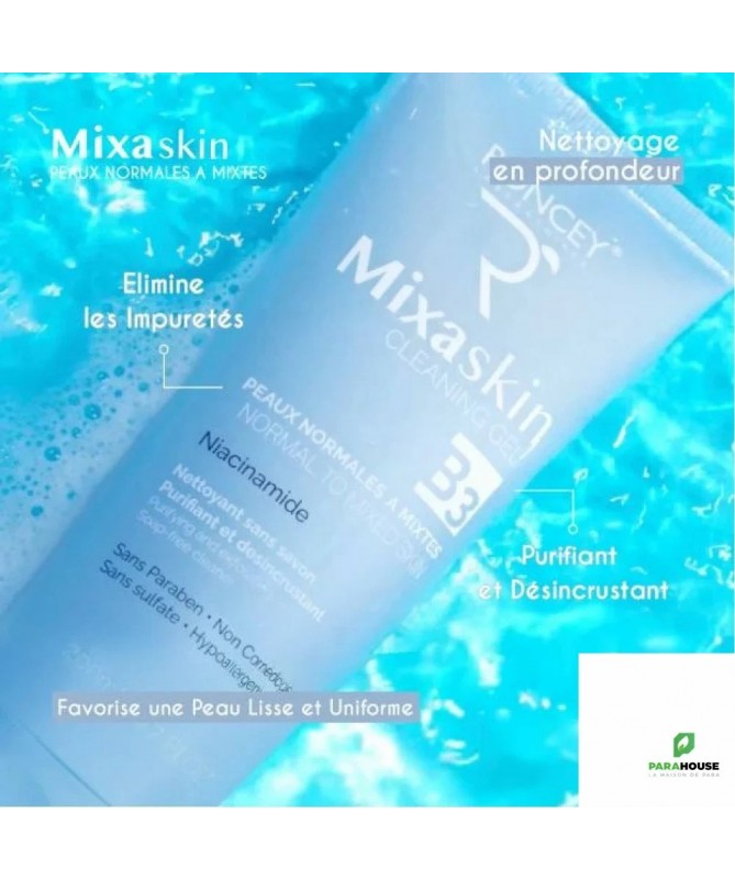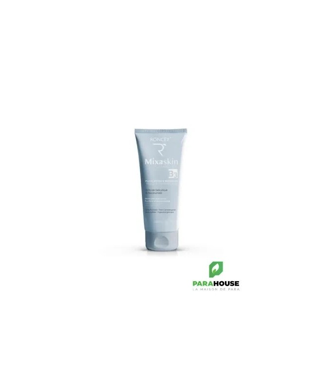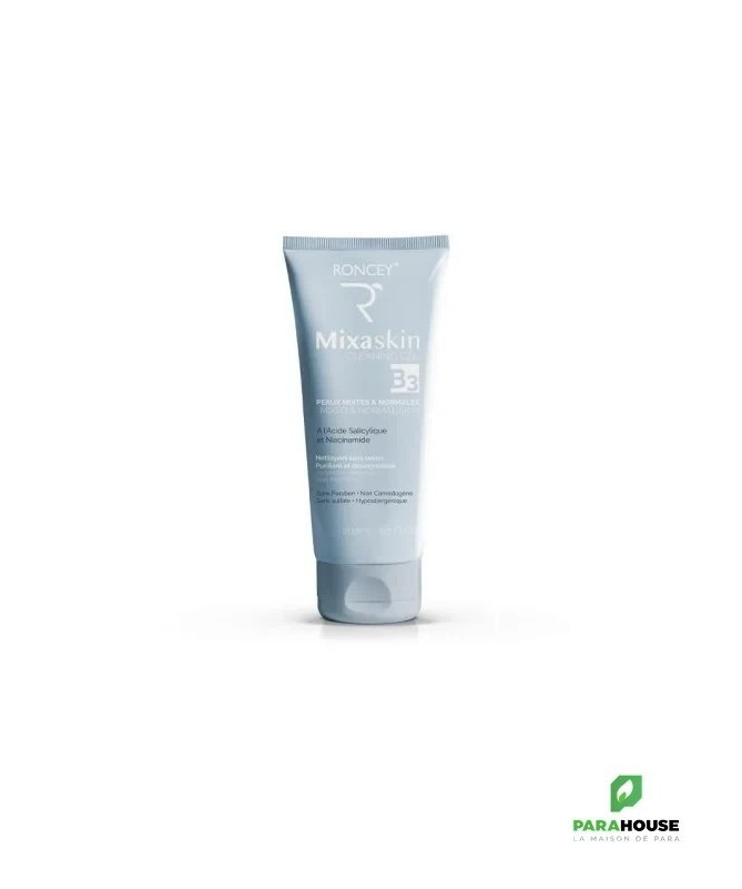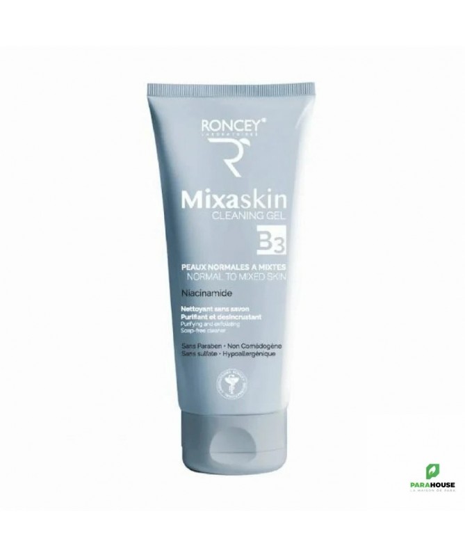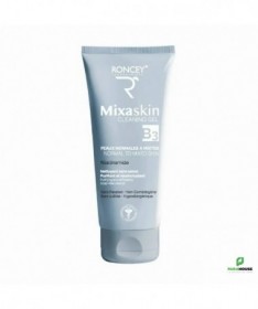 RONCEY MIXASKIN GEL NETTOYANT PEAUX NORMALES A MIXTES 200ML RONCEY MIXASKIN GEL NETTOYANT PEAUX NORMALES A MIXTES est spécialement formulé pour débarrasser votre peau des impuretés sans l'agresser. Sa texture gel mousse légèrement pour éliminer en douceur les excès de sébum, les cellules mortes et les résidus de maquillage. Riche en Niacinamide et Acide Salicylique, il nettoie, purifie et prépare votre peau à recevoir vos soins dans les meilleures conditions. Le Gel Nettoyant Roncey Mixaskin représente l'étape essentielle d'un rituel de beauté réussi pour les peaux normales à mixtes. Bien plus qu'un simple nettoyant, ce soin lavant associe efficacité et respect de l'épiderme grâce à une formule innovante sans sulfate, sans parabène et non comédogène. Les Bienfaits du Gel Nettoyant Mixaskin : En choisissant ce gel nettoyant, vous optez pour une solution multi-bénéfiques : Nettoyage Profond en Douceur : Formule sans sulfate qui élimine toutes les impuretés sans altérer le film hydrolipidique protecteur de la peau. Pores Désobstrués et Purifiés : L'Acide Salicylique exfolie en douceur et favorise le débouchage des pores pour une peau plus nette. Teint Lumineux et Uniforme : La Niacinamide stimule le renouvellement cellulaire pour une peau plus lisse, ferme et rayonnante. Peau Hydratée et Apaisée : Le Biosaccharide Gum-1 hydrate et revitalise la peau pendant le nettoyage. Formule Sûre et Respectueuse : Sans parabens, non comédogène et hypoallergénique pour une tolérance optimale même pour les peaux sensibles. Idéal pour : Les peaux mixtes avec des zones grasses (front, nez, menton) Les peaux normales nécessitant un nettoyage quotidien efficace Les peaux à tendance acnéique nécessitant une purification en profondeur Les peaux sensibles cherchant un nettoyant doux sans sulfate Composition : Aqua, Sodium Lauroyl Sarcosinate, Cocamidopropyl Betaine, Disodium Lauryl Sulfosuccinate, Coco Glucoside, PEG-90 Glyceryl Isostearate (and) Laureth-2, Biosaccharide gum-1, Glycerin, Salicylic Acid, Disodium Cocoyl Glutamate, Niacinnamide, Sodium Benzoate, Potassium Sorbate, Glyceryl Oleate, Fragrance. Sans Paraben Non Comédogène Sans sulfate Hypoallergénique Conseils d'utilisation : Faire mousser une noisette de gel dans les mains et appliquer sur le visage et le corps humidifié. Massez pendant une minute environ. Rincer abondamment. A utiliser matin et soir. L’effet est ressenti dès la première utilisation.