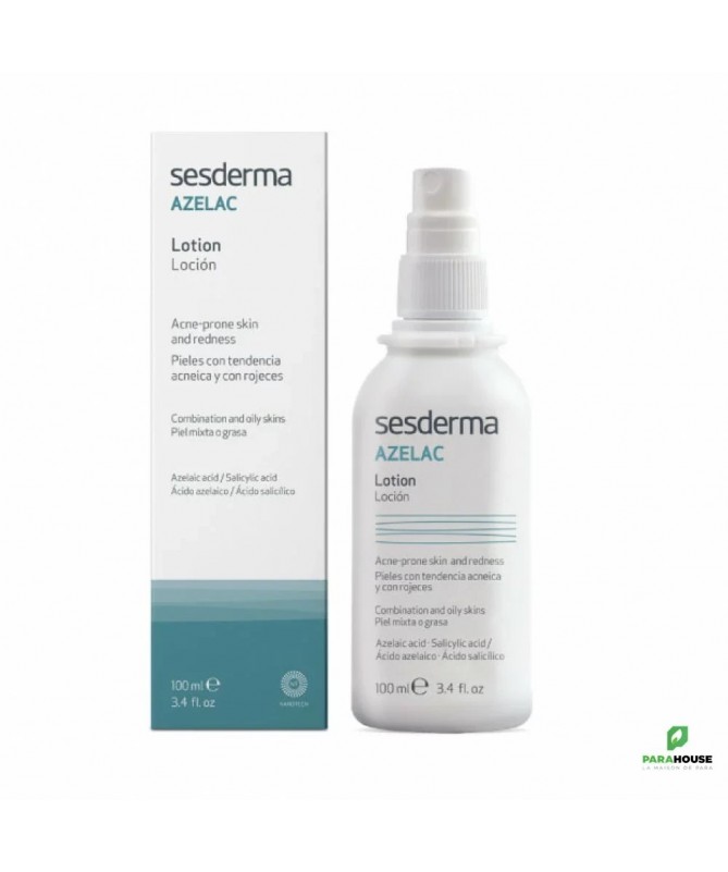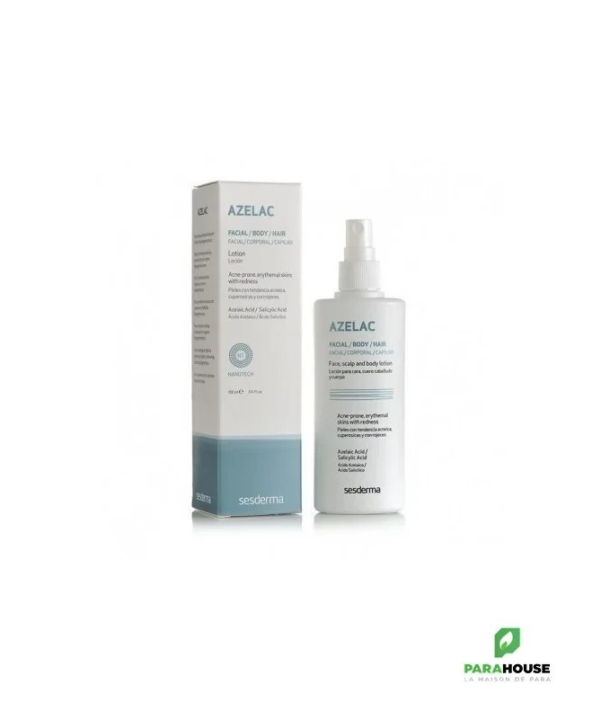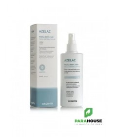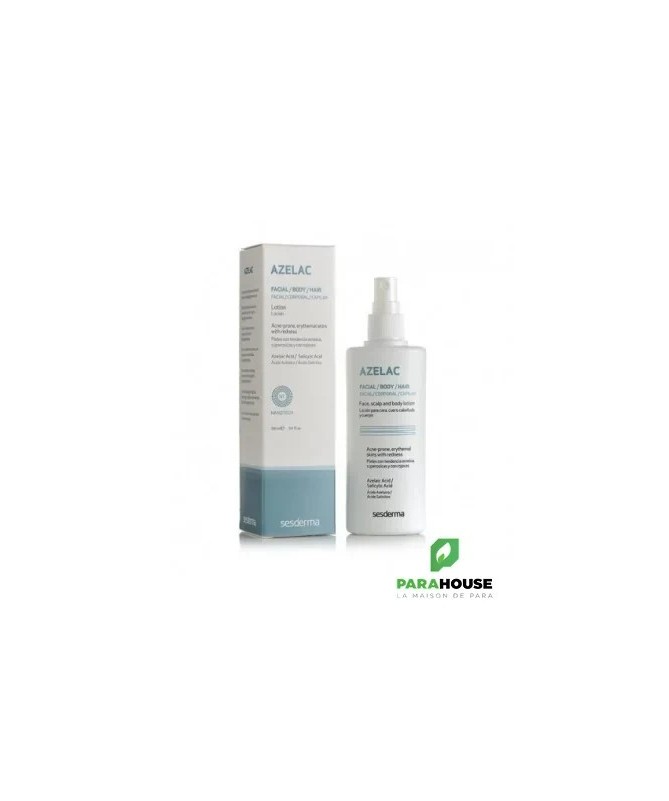 SESDERMA AZELAC LOTION SESDERMA Azelac lotion permet la prévention et le traitement des peaux grasses et à tendance acnéique. SESDERMA AZELAC LOTION est particulièrement adaptée aux peaux grasses ou à tendance acnéique : pour le visage, le cou, le dos, le cuir chevelu, les bras et les jambes. Azelac sesderma lotion permet d'accéder à toutes les zones du corps. Avec son action calmante, il permet de diminuer les rougeurs et de réguler la production de sébum Elle apaise la peau, neutralise les rougeurs et régule l’excès de sébum. SESDERMA Azelac lotion est parfait pour les peaux à rosacée :la rosacée papulo-pustuleuse, caractérisée par les petits boutons. Ses actifs agissent doublement :l’acide azélaïque et l’acide salicylique, ont une action séborégulatrice et bactéricide. Sesderma lotion azelac est aussi un soin des peaux à rosacée, rougeurs et couperose. Réduit l’érythème et les rougeurs du visage. Acné et peaux à tendance acnéique. Pigmentations cutanées. Folliculite liée au rasage ou l’épilation. Sa grande efficacité est due à sa teneur en acide salicylique qui possède une importante action comédolytique, bactériostatique, fongistatique, sébostatique, kératolytique et apaisante. L’action de l’acide salicylique est renforcée par l’acide azélaïque, dont l’effet bactériostatique, anti-irritant et séborégulateur contribue à traiter et à améliorer l’aspect des peaux grasses et à tendance acnéique Composition : 2 % acide salicylique, 5% acide azélaïque. ALCOHOL DENAT, AQUA, PROPYLENE GLYCOL, AZELAIC ACID, SALICYLIC ACID, PEG/PPG-20/6 DIMETHICONE, PENTAERYTHRITYL TETRA-DI-T-BUTYL HYDROXYHYDROCINNAMATE, TRIISOPROPANOLAMINE, PHENOXYETHANOL, ETHYLHEXYLGLYCERIN Conseils d'utilisation : Pour cuir chevelu / corps: il est recommandé de l'appliquer à l'aide d'un coton sur la zone à traiter. Pour les poils incarnés / points noirs: il est recommandé de l'appliquer matin et soir jusqu'à ce qu'ils disparaissent. Pour rasage / Épilation: il est recommandé de l'appliquer quelques heures avant le Rasage ou immédiatement après l'épilation.