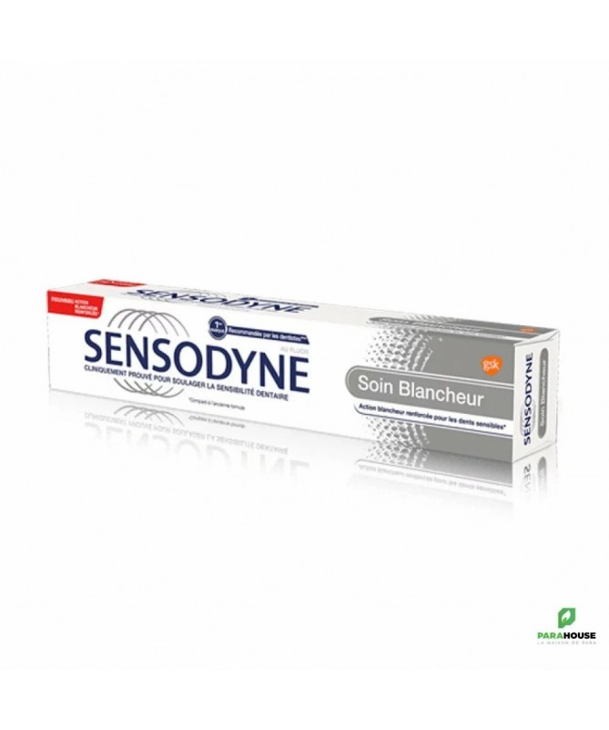 Sensodyne Soin Blancheur Protection Sensibilité 24h Sensodyne Protection Sensibilité 24h - Soin Blancheur Sensodyne dentifrice permet un s oulagement de la sensibilité dentaire, la protection longue durée contre la sensibilité dentaire, la protection contre les caries, un goût frais Blancheur, Émail renforcé et protection contre la plaque dentaire Le dentifrice Sensodyne Soin Blancheur contient du nitrate de potassium. Il agit directement à l’intérieur de la dent et crée une protection apaisante autour du nerf pour soulager la sensibilité dentaire. En brossage quotidien deux fois par jour, Sensodyne permet de protéger les dents sensibles pendant 24h. Au quotidien, Sensodyne Soin Blancheur : aide à éliminer les taches tout en respectant l’émail. Il aide à restaurer la blancheur naturelle des dents. renforce l’émail. Il contient du fluor actif qui favorise la reminéralisation de l’émail. Compositions: Nitrate de potassium et fluorure de sodium (1400 ppm). Agit par désensibilisation des terminaisons nerveuses. À conserver à une température inférieure à 30°C. Conseils d'utilisation: Il est recommandé de se brosser les dents deux fois par jour, et de ne pas dépasser trois brossages. Évitez d'avaler le dentifrice et recrachez-le après brossage. Pour un soulagement optimal, il est recommandé d’utiliser Sensodyne deux fois par jour, tout au long de l’année.