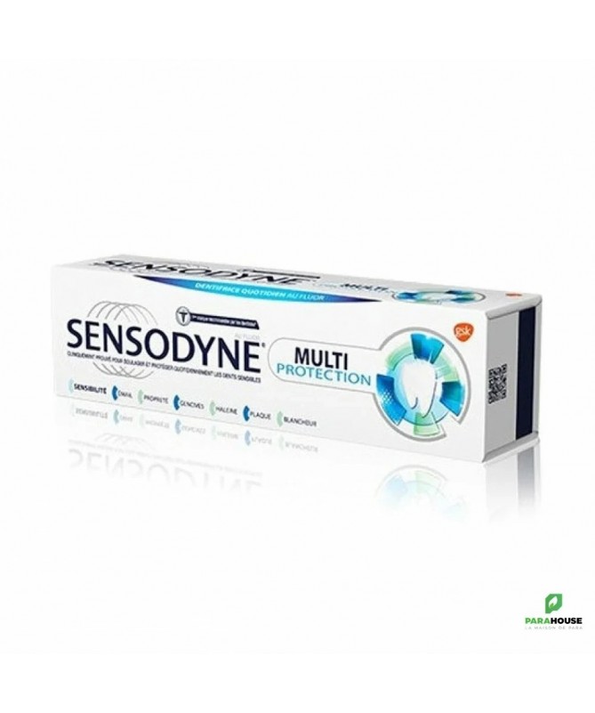 Sensodyne Multi Protection Blancheur 75ML Sensodyne Multi Protection Blancheur a une formule à base de fluorure stanneux, spécialement développée pour apporter aux dents sensibles toute la protection dont elles ont besoin pour être en parfaite santé. Avec un brossage deux fois par jour, il : Renforce et protège l’émail Rafraîchit l’haleine Protège contre la plaque dentaire Le fluorure stanneux restaure une couche protectrice sur les zones sensibles des dents Procure une sensation de propreté Maintient les gencives saines Blanchit l’émail Soulagement de la sensibilité dentaire Protection longue durée contre la sensibilité dentaire Protection contre les caries Goût frais Émail renforcé Sensation de propreté Protection des gencives Haleine fraîche Protection contre la plaque dentaire Composition : Fluorure de Na 1450 ppm F, arôme menthe, excipients qsp 100 %. Glycerin, PEG 8, silica, calcium sodium phosphosilicate (Novamin), sodium lauryl sulfate, sodium monofluorophosphate, aroma, titanium dioxide, carbomer, potassium acesulfame, limonene. Conseils d'utilisation : Il est recommandé de se brosserles dents, avec Sensodyne dentifrice Multi Protection Blancheur deux fois par jour, et de ne pas dépasser trois brossages. Évitez d'avaler le dentifrice et recrachez-le après brossage. Refermer le tube après utilisation pour protéger le contenu de l'humidité.