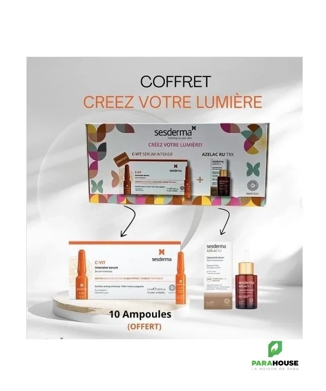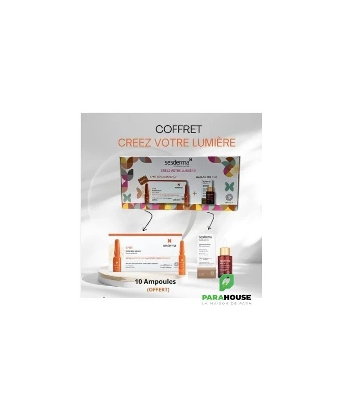 Découvrez le nouveau Coffret Sesderma, là où vous trouvez des concentrés de beauté en un seul clic. Ce pack spécial combine deux produits complémentaires pour illuminer votre peau et lutter contre les signes de l'age. Il comporte : - Azelac Ru sérum liposomé dépigmentant de 30ml - C-vit Sérum intensif en 10 ampoules chacune de 1.5ml (Offert)