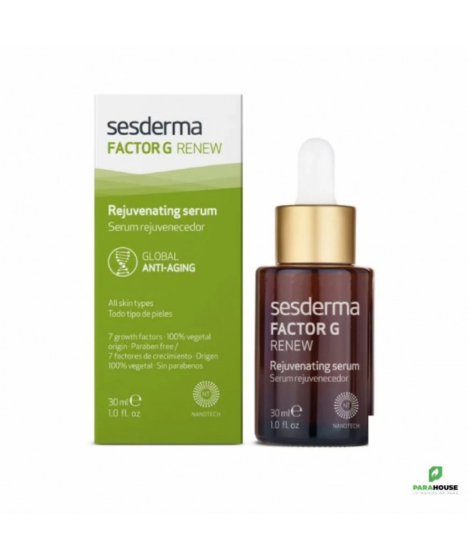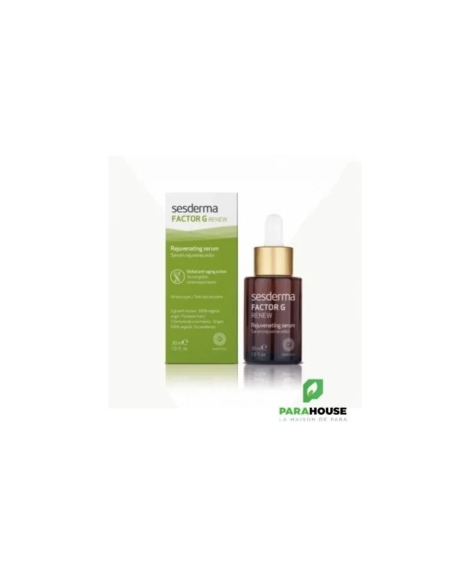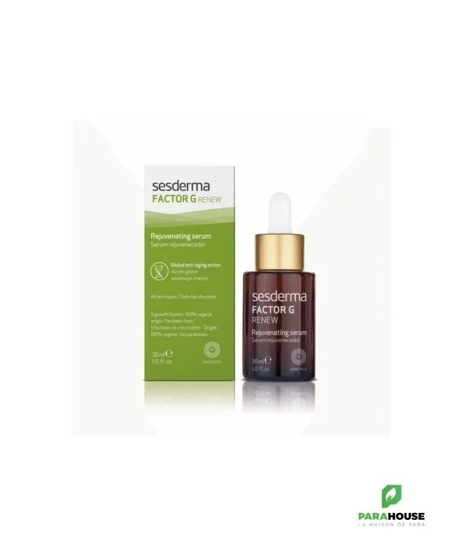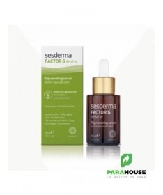 SESDERMA FACTOR G RENEW SÉRUM 30ML Le sérum Factor G de Sesderma Contient des facteurs de croissance d'origine végétale qui réactivent le fonctionnement de la peau, en stimulant la synthèse du collagène et de l'élastine. Le Factor G incorpore des facteurs de croissance d'origine végétale qui réactivent le fonctionnement de la peau en stimulant la synthèse de collagène et d'élastine. Tout cela se traduit par une amélioration de l'état de la peau, apportant jeunesse et vitalité. Afin de prévenir et de traiter les manifestations du vieillissement cutané, Cela se traduit par une amélioration de l'état de la peau, qui retrouve jeunesse et vitalité. De plus, la Centella asiatica et les cellules souches ont des propriétés antioxydantes (qui protègent la peau des agressions des radicaux libres), réparatrices et régénératrices. Ces actifs possèdent également des propriétés anti-inflamatoires nentraînant aucune irritation, exfoliation ou augmentation de la sensibilité au soleil, c'est pourquoi SESDERMA FACTOR G SÉRUM est particulièrement recommandé pour les peaux sensibles et réactives. Une fois ce concentré intégré à votre rituel, vous remarquerez l’aspect rénové de votre peau, qui est hydratée et plus ferme, en 28 jours. Composition : Vitamine E, facteurs de croissance (TGFβ2, HGH et GM-CSF), peptides mimétiques, cellules souches de malus domestica, quercétine, ergothionéine, ptérostilbène, extrait de centella asiatica. Conseils d'utilisation : Il est indiqué d'appliquer 4 gouttes de SESDERMA FACTOR G RENEW SÉRUM sur la main et massez le visage avant le traitement habituel. Vous pouvez l’utiliser aussi bien le matin que le soir Associez-le à vos soins de beauté habituels, toujours sur une peau propre, juste avant l’application de textures en crème. Et n’oubliez pas d’utiliser une protection solaire