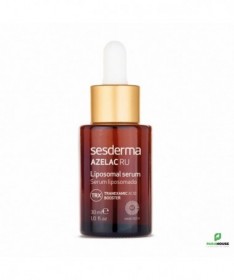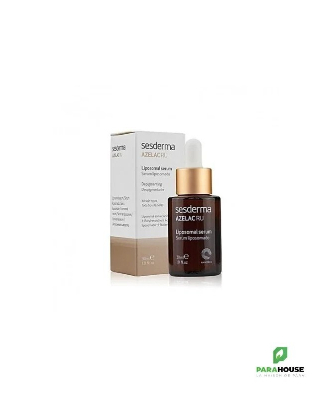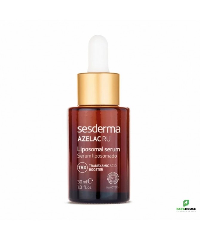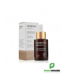 SESDERMA AZELAC RU SÉRUM LIPOSOMÉ 30ML SESDERMA AZELAC RU est un sérum dépigmentant qui se caractérise par ses principes actifs liposomés pour agir directement à l'origine des taches, et unifier également le teint. Il peut être utiliser durant toute l'année y compris l’été, avant d’appliquer la protection solaire. SESDERMA AZELAC RU en profondeur en éclaircissant et réduisant le volume des taches tout en prévenant l’apparition de nouvelles taches. SESDERMA AZELAC RU SÉRUM convient aussi bien peaux sèches, mixtes ou grasses. Pour toutes celles qui se préoccupent de prévenir et réduire les taches sur leur peau. Et durant toute l’année. Composition : Diacetil boldine, ascorbyl glucoside, acide glycyrrhétinique, acide azélaïque, 4-butylresorcinol, undecylenoyl phenylalanine, rétinol, niacinamide encapsulés dans des liposomes. AQUA, LECITHIN, PROPANEDIOL, ALCOHOL, BELLIS PERENNIS FLOWER EXTRACT, POLYMETHYL METHACRYLATE, PEG-40 HYDROGENATED CASTOR OIL, PROPYLENE GLYCOL, PENTAERYTHRITYL TETRA-DI-T-BUTYL HYDROXYHYDROCINNAMATE, 4-BUTYLRESORCINOL, ALCOHOL DENAT, ASCORBYL GLUCOSIDE, AZELAIC ACID, BHA, BHT, CAPRYLIC/CAPRIC TRIGLYCERIDE, CARBOMER, CITRONELLYL METHYLCROTONATE, CITRUS GRANDIS FRUIT EXTRACT, DIACETYL BOLDINE, DIPOTASSIUM PHOSPHATE, DISODIUM EDTA, DISODIUM PHOSPHATE, ETHYLHEXYLGLYCERIN, GLYCERIN, GLYCYRRHETINIC ACID, HYDROCHLORIC ACID, HYDROXYPROPYL CYCLODEXTRIN, MELISSA OFFICINALIS LEAF EXTRACT, MORUS ALBA ROOT EXTRACT, NIACIN, NICOTIANA BENTHAMIANA SH-POLYPEPTIDE-7, PARFUM, PEG/PPG-20/6 DIMETHICONE, PHENETHYL ALCOHOL, PHENOXYETHANOL, POLYSORBATE 20, POTASSIUM PHOSPHATE, POTASSIUM SORBATE, RETINAL, RETINOL, SODIUM CHLORIDE, SODIUM CHOLATE, SODIUM HYDROXIDE, TOCOPHERYL ACETATE, TRANEXAMIC ACID, TRIETHANOLAMINE, TRIISOPROPANOLAMINE, UNDECYLENOYL PHENYLALANINE, XANTHAN GUM Mode d'emploi : Vous pouvez l’utiliser aussi bien le matin que le soir. Associez-le à vos soins de beauté habituels, toujours sur une peau propre, juste avant l’application de textures en crème. Et n’oubliez pas d’utiliser une protection solaire Appliquer 4 gouttes du produit dans votre main puis massez les zones à traiter avant l'utilisation de votre traitement habituel. Il est recommandé d'utiliser un photoprotecteur solaire.