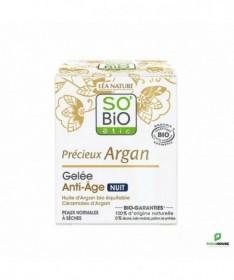SO BIO PRECIEUX ARGAN GELEE ANTI AGE DE NUIT Riche en huile et céramides d'argan, SO BIO PRECIEUX ARGAN GELEE DE NUIT Régénère et repulpe la peau tout en protègeant contre es signes de l'âge . Sa texture gélifiée se transforme en huile pour une agréable utilisation . Au réveil, vos traits sont lissés, votre peau est souple et repulpée. Formulé avec : 10% d'huile d'argan bio reconnue pour ses vertus anti-âge hydratantes et nourrissantes. des céramides d'argan : renforcent la barrière cutanée, améliorent l'élasticité et la fermeté de la peau. 100% d'origine naturelle, 0 paraben, silicone, parfum de synthèse Testé sous contrôle dermatologique. Compostion : Isopropyl Palmitate, Helianthus Annuus (Sunflower) Seed Oil, Argania Spinosa Kernel Oil*, Coco-Caprylate/Caprate, Isopropyl Myristate, Coco-Caprylate, Dicaprylyl Carbonate, Dextrin Palmitate, Hexyldecanol, Hexyldecyl Laurate, Parfum (Fragrance), Argan Oil Aminopropanediol Esters, Tocopherol, Linalool, Limonene, Benzyl Salicylate, Anise Alcohol, Amyl Cinnamal, Geraniol, CI 75120 (Annatto), Ascorbyl Palmitate * ingrédients issus de l'agriculture biologique. 100% du total des ingrédients sont d'origine naturelle. 21% du total des ingrédients sont issus de l'agriculture biologique. Conseils d'utilisation: Sur une peau parfaitement nettoyée,a ppliquer SO BIO PRECIEUX ARGAN GELEE DE NUIT le soir, par petites touches.