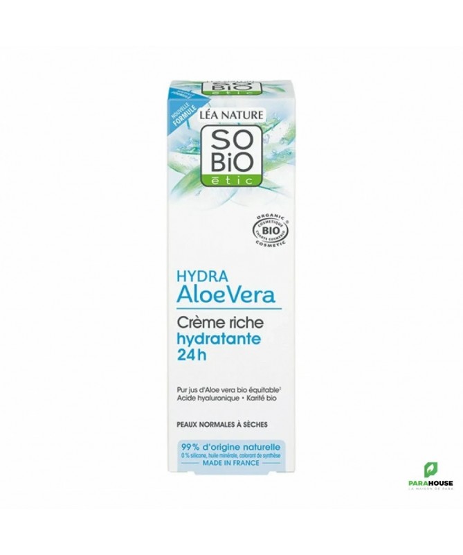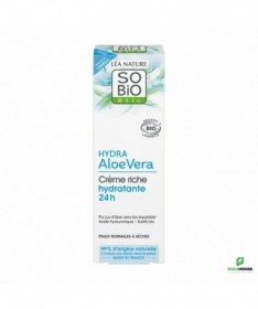 SO BIO HYDRA ALOE VERA CREME RICHE HYDRATANTE 24H 50ML SO BIO HYDRA ALOE VERA CREME RICHE HYDRATANTE 24H apporte un confort et une hydratation intense pendant 24h. Sa texture onctueuse enveloppe la peau de douceur et la protège durablement du dessèchement. 99% d’origine naturelle 0% silicone, parfum de synthèse Composition : EAU / WATER / AQUA : Eau purifiée ALOE BARBADENSIS LEAF JUICE* : Jus d’Aloe vera équitable de Mexique hydratant CAPRYLIC/CAPRIC TRIGLYCERIDE : Émollient d’origine naturelle GLYCERIN : Humectant d’origine naturelle COCO-CAPRYLATE/CAPRATE : Émollient d’origine naturelle OCTYLDODECANOL : Émollient d’origine naturelle GLYCERYL STEARATE CITRATE : Émulsionnant d’origine naturelle CETEARYL ALCOHOL : Agent de consistance d’origine naturelle PENTYLENE GLYCOL : Humectant d’origine naturelle BUTYROSPERMUM PARKII (SHEA) BUTTER* : Beurre de Karité bio équitable nourrissant HYDROXYSTEARIC/LINOLENIC/OLEIC POLYGLYCERIDES : Émollient d’origine naturelle ALOE BARBADENSIS LEAF JUICE POWDER* : Concentré d’Aloe vera bio équitable de Mexique hydratant SODIUM HYALURONATE : Acide hyaluronique d’origine naturelle protecteur TOCOPHEROL : Vitamine E d’origine naturelle JOJOBA ESTERS : Émollient d’origine naturelle BENTONITE : Gélifiant d’origine naturelle XANTHAN GUM : Gélifiant d’origine naturelle CETEARYL GLUCOSIDE : Émulsionnant d’origine naturelle PARFUM (FRAGRANCE) : Parfum 100% d’origine naturelle LEVULINIC ACID : Stabilisant d’origine naturelle SODIUM LEVULINATE : Stabilisant d’origine naturelle PHYTIC ACID : Stabilisant d’origine naturelle BENZYL ALCOHOL : Conservateur d’origine naturelle SODIUM BENZOATE : Conservateur d’origine naturelle SODIUM HYDROXIDE : Ajusteur de pH d’origine naturelle CITRIC ACID : Ajusteur de pH d’origine naturelle LIMONENE : Allergène naturel issu des plantes, présent dans la composition parfumée 100% d’origine naturelle LINALOOL : Allergène naturel issu des plantes, présent dans la composition parfumée 100% d’origine naturelle CITRONELLOL : Allergène naturel issu des plantes, présent dans la composition parfumée 100% d’origine naturelle Conseils d'utilisation : Appliquez SO BIO HYDRA ALOE VERA CREME RICHE HYDRATANTE 24H matin et/ou soir sur le visage préalablement nettoyé.