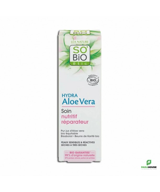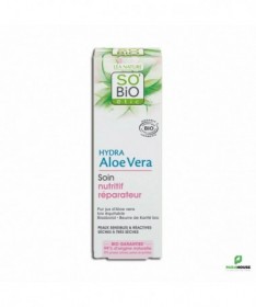 SO BiO HYDRA ALOE VERA SOIN NUTRITIF REPARATEUR 50ML - PEAUX SENSIBLES & RÉACTIVES SÈCHES À TRÈS SÈCHES SO BiO HYDRA ALOE VERA SOIN NUTRITIF REPARATEUR hydrate et nourrit durablement la peau. Il est particulièrement efficace sur les peaux sensibles, fragilisées et sèches sujettes à des rougeurs, des tiraillements ou des picotements et démangeaisons causés par les agressions extérieures telles que l'eau calcaire, le vent, le soleil. Élaboré avec des actifs 99% naturels, la texture baume de ce soin quotidien enveloppe la peau d’un voile réparateur qui apaise les irritations. EFFICACITE TESTÉE La peau est nourrie durablement : 90% La peau est réparée : 80% La peau tiraille moins : 90% Composition : Aqua (Water)Aloe Barbadensis Leaf Juice [1]Butyrospermum Parkii (Shea) Butter [1]Rosa Damascena Flower Water [1]Olus Oil (Vegetable Oil)Dicaprylyl CarbonateGlycerinC 10-18 TriglyceridesOctyldodecanolPropanediolGlyceryl Stearate CitrateCetearyl OlivateSorbitan Olivatebentonite (volcanic clay)Parfum (Fragrance)Sodium Stearoyl GlutamateSodium LevulinateBehenyl AlcoholHydrogenated Vegetable OilXanthan GumSodium BenzoateBisabololGlyceryl CaprylateGlyceryl UndecylenatePhytic AcidCandelilla Cera (Euphorbia Cerifera) WaxLactic AcidSodium HydroxideCitric AcidTocopherolGlycine Soja (Soybean) Oil 99% d’origine naturelle 0% silicone, parfum de synthèse Conseils d'utilisation : Il est recommande d'appliquer SO BiO HYDRA ALOE VERA SOIN NUTRITIF REPARATEUR le matin et/ou le soir sur l’ensemble du visage parfaitement nettoyé.