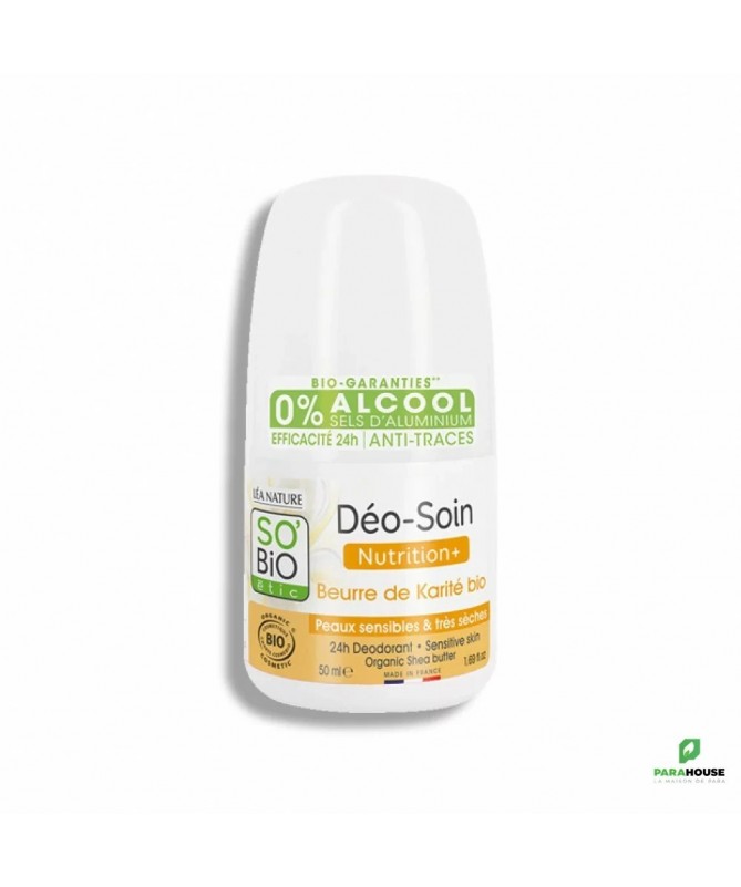 SO BIO DEO SOIN NUTRITION BEURRE DE KARITE SO BIO DEO SOIN NUTRITION BEURRE DE KARITE est composé d'ingrédients 99% d'origine naturelle et est enrichi en poudres absorbantes d'origine naturelle. SO'BiO Déo soin au karité garantit une efficacité 24 heures contre les mauvaises odeurs. enrichi en actif purifiant, il protège la peau naturellement sans bloquer la transpiration. • 99% d'origine naturelle • sans sels d'aluminium ni alcool Déodorant bille de 50ml Composition : Aqua /Water/Eau, Propanediol, Hamamelis Virginiana (Witch Hazel) Water*, Talc, Triethyl Citrate, Butyrospermum Parkii (Shea) Butter*, Parfum (Fragrance), Xanthan Gum, Zinc PCA, Candida Bombicola/Glucose/Methyl Rapeseedate Ferment, Sodium Levulinate, Decyl Glucoside, Glycerin, Sodium Benzoate, Glyceryl Caprylate, Phytic Acid, Sodium Hydroxide, Lactobacillus Ferment, Aloe Barbadensis Leaf Juice Powder*, Tocopherol, Lactic Acid, Potassium Sorbate, Helianthus Annuus (Sunflower) Seed Oil. 99% du total est d’origine naturelle 21% du total des ingrédients sont issus de l’agriculture biologique. *ingrédients issus de l’agriculture biologique TESTÉ DERMATOLOGIQUEMENT
