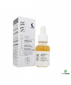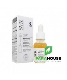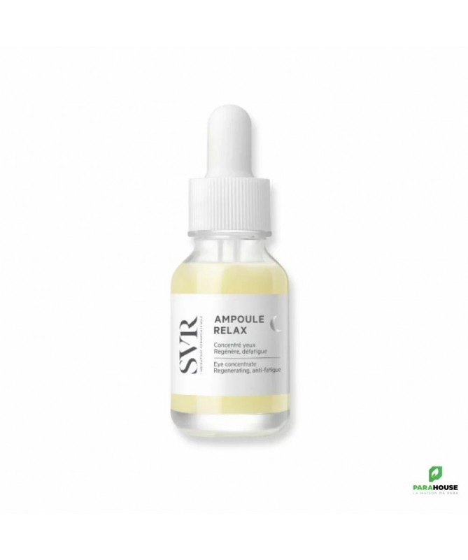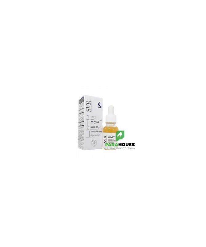 SVR AMPOULE RELAX - Concentre Yeux Nuit 15ML SVR AMPOULE RELAX NIGHT est une formule riche et puissante qui hydrate en profondeur et apaise la peau de contours des yeux meme les plus sensibles et porteurs de lentilles. A utiliser uniquement la nuit, ce sérum oléo-gel apaise, détend et regénère la peau des contours des yeux. La formule de SVR AMPOULE RELAX contient du Gaba, agit comme un relaxant cutané pour défroisser et tonifier la peau, le regard est détendu et les rides et ridules visiblement lissées. Complétée par un post-biotique, cette formule associée au massage va favoriser la microcirculation pour corriger significativement cernes et poches. Sa pipette permet de masser la zone à traiter et permet ainsi de calmer et apaiser la peau. EFFICACITÉ PROUVÉE : -15% réduit la surface et la couleur des cernes -14% réduit les poches -17% réduit les rides de la patte d’oie +23% lisse le regard Composition : NGREDIENTS : GLYCERIN, BUTYLENE GLYCOL, AQUA/WATER/EAU, ALBIZIA JULIBRISSIN BARK EXTRACT, TOCOPHERYL ACETATE, CARBOMER, PROPANEDIOL, HELIANTHUS ANNUUS (SUNFLOWER) SEED OIL, AMINOBUTYRIC ACID, CAPRYLIC/CAPRIC TRIGLYCERIDE, XANTHAN GUM, BACILLUS FERMENT, GLYCERYL CAPRYLATE, BIXA ORELLANA SEED EXTRACT, SODIUM BENZOATE, SODIUM HYDROXIDE, TOCOPHEROL, CITRIC ACID Testé sous contrôle dermatologique et ophtalmologique. Convient aux porteurs de lentilles. Conseils d'utilisation : Il est indiqué de prélever une petite quantité de SVR AMPOULE RELAX avec la pipette, l e soir sur peau propre et sèche. appliquer sur le contour de l’œil, puis masser avec l’embout lisse. Vous pouvez terminer le geste avec le bout des doigts pour finir de faire pénétrer le soin. Ne pas appliquer dans l’œil. Pour maximiser l’efficacité de l’ampoule, n’hésitez pas à appliquer les gestes d’automassages.