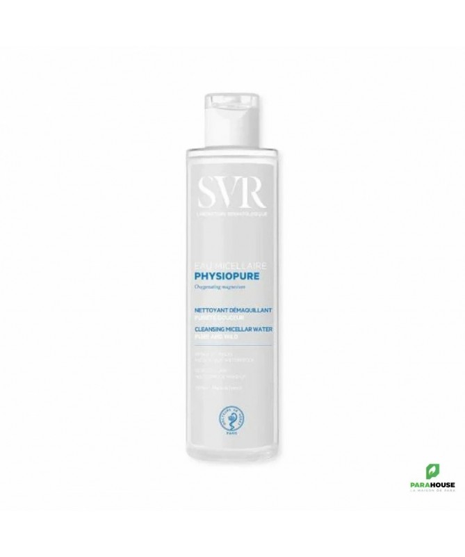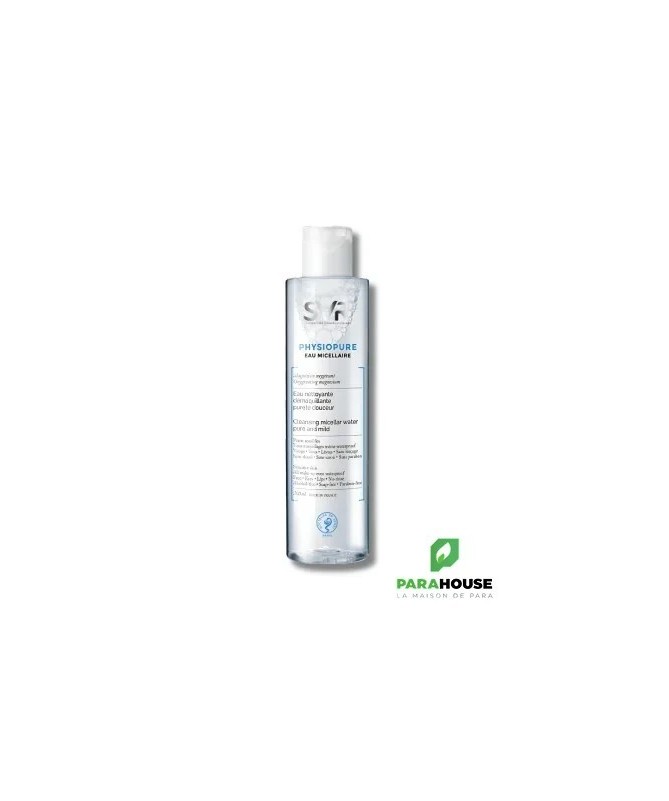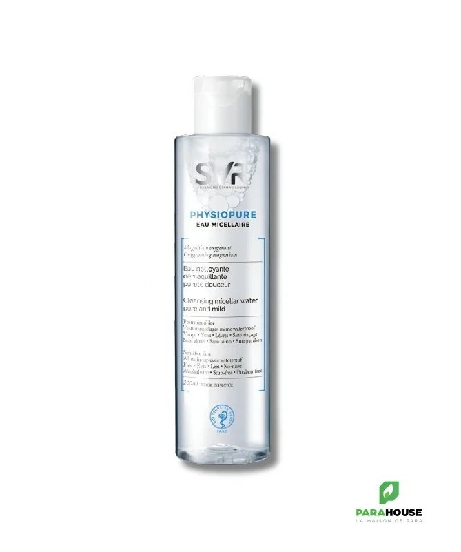 SVR PHYSIOPURE EAU MICELLAIRE 200ML SVR PHYSIOPURE EAU MICELLAIRE continet le magnésium oxygénant C'est une eau physiopure nettoyante qui méne à une sensation de pureté et de douceur SVR PHYSIOPURE EAU MICELLAIRE démaquille en un seul geste même le maquillage waterproof C'est une eau nettoyante qui élimine efficacement les impuretés pour une peau nette et oxygénée. Une charte de formulation stricte adaptée aux peaux sensibles. Hypoallergénique. Composition: Formule INCI : peg-7 glyceryl cocoate, aqua (purified water), peg-6 caprylic/capric glycerides, 1.2 hexanediol, pentylene glycol, propanediol, magnesium pca, cetrimonium bromide, citric acid, parfum NB : Sans alcool.Sans savon.Sans paraben. Conseils d'utilisation: Il est conseillé d'appliquer SVR PHYSIOPURE EAU MICELLAIRE à l'aide d'un coton