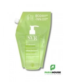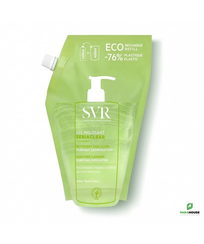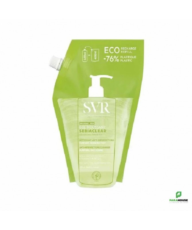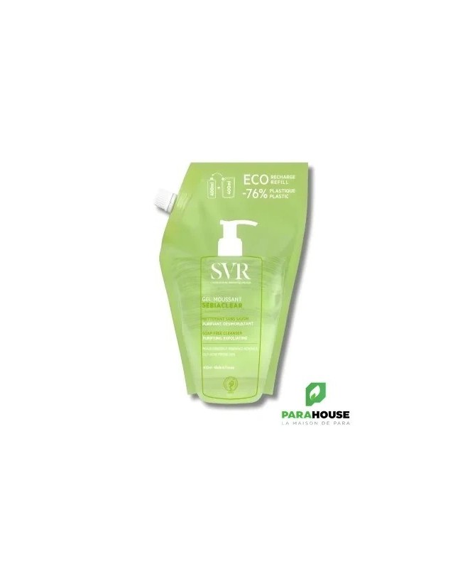 Description :SVR Sebiaclear Gel Moussant est un nettoyant sans savon qui purifie et désincruste la peau tout en douceur. Sa mousse onctueuse aide à éliminer les impuretés et à se débarrasser de l’excès de sébum sans dessécher. Facile à rincer, il laisse la peau parfaitement nette, fraîche et matifiée.SVR Sebiaclear Gel Moussant convient aux peaux sensibles, mixtes à grasses et à tendance acnéique.Pour combattre les imperfections nous avons le réflexe de vouloir les décaper avec des produits agressifs. Erreur, il faut au contraire la nettoyer en douceur pour ne pas stimuler la production de sébum, pour ne pas l’irriter davantage.Efficacité prouvée sur les peaux sensibles a tendance acnéique•100% : la peau est purifiée•100% : l’excès de sébum est éliminé•100% : les pores sont désincrustés•100% : la peau est douceConseils d’utilisation :Appliquer SVR Sebiaclear Gel Moussant sur peau mouillée, faire mousser puis rincer. Matin et soir ou seulement le matin avec, en relais, l’Eau Micellaire SEBIACLEAR pour le démaquillage du soir.L’éco-recharge, un geste simple en 3 étapes :1/ Retirer la pompe de votre flacon.2/ Verser le gel moussant de l’éco-recharge dans le flacon de Sebiaclear Gel moussant 400ml ou de votre flacon préféré.3/ Repositionner la pompe pour une nouvelle utilisationComposition :Aqua/Water/Eau, Disodiumlaureth Sulfosuccinate, Coco-Betaine, Peg-7 Glyceryl Cocoate, Glycerin, Sodium Laureth Sulfate, Gluconolactone, Peg-120 Methyl Glucose Dioleate, Calcium Gluconate, Sarcosine, Butylene Glycol, Sodium Citrate, Sodium Hydroxide, Xanthan Gum, Sodium Benzoate, Citric Acid, Pentylene Glycol, Sodium Chloride, Parfum (Fragrance)