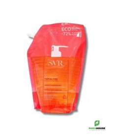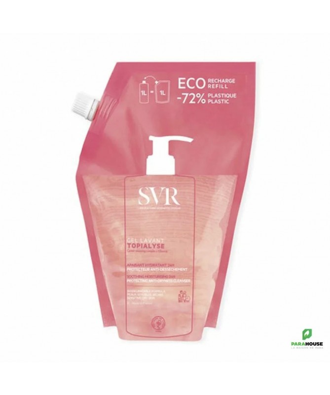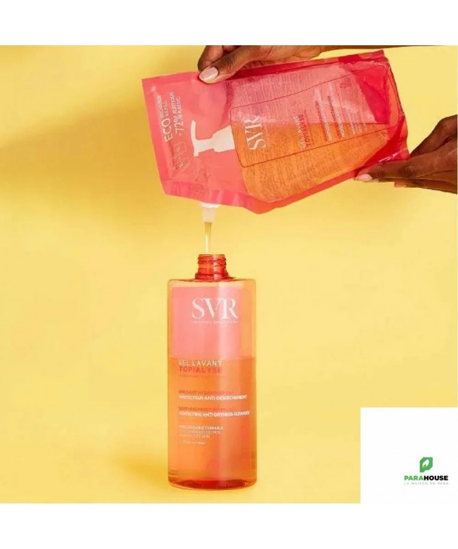 SVR TOPIALYSE GEL LAVANT ECO-RECHARGE 1L SVR TOPIALYSE GEL LAVANT nettoie en douceur tout en protègeant les peau sensibles et sèche de la tête aux pieds de toute la famille. Il se caractérise par un format familial d'1L. C'est un vr gel nettoyant doux protecteur anti-dessèchement sans savon dans sa formule. Il convient autant aux adultes qu'aux nourrissons ayant la peau sèche et sensible.grâce à sa composition riche aux Oméga-3, 6 et 9 permettant de respecter le film hydrolipidique et apaiser les peaux tiraillées par la sécheresse cutanée. Il se caractérise par un pH physiologique. Conseils d'utilisation : Il est indiqué de l'appliquer TOPIALYSE GEL LAVANT d'une façon quotidienne sur une peau mouillée et puis faire mousser et rincer. Nourrisson dès la naissance (hors prématuré), enfant, adulte. Corps, visage, hygiène intime. Convient au cuir chevelu. Ne pique pas les yeux Composition: AQUA/WATER/EAU, SODIUM C14-16 OLEFIN SULFONATE, COCO-GLUCOSIDE, COCO-BETAINE, GLYCERIN, PARFUM (FRAGRANCE), CITRIC ACID, SODIUM BENZOATE, POTASSIUM SORBATE, SODIUM PHYTATE ECORECHARGE : UNE SOLUTION GAGNANTE • Réduction de plastique : 1 éco-recharge 1L = 2,5 flacons 400ml = -81,5% de plastique ! • Plus économique : l’éco-recharge est moins coûteuse qu’un flacon 1L, profitez-en !