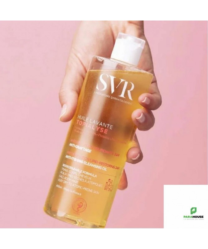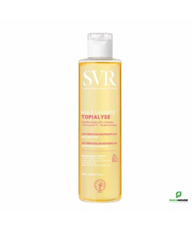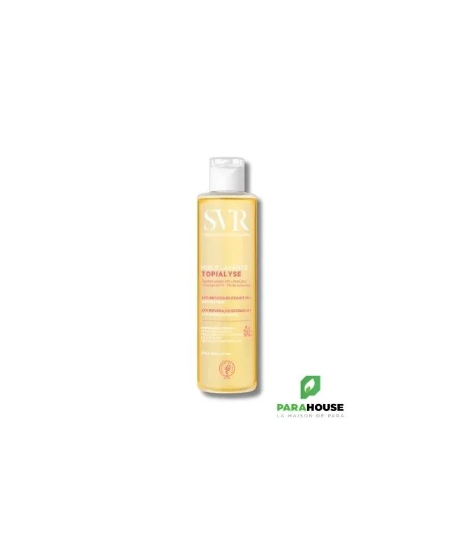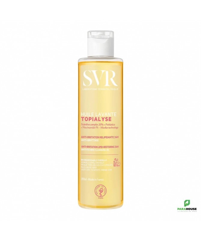 SVR TOPIALYSE HUILE LAVANTE ANTI-GRATTAGE SVR TOPIALYSE HUILE LAVANTE est la 1ére huile micellaire qui nettoie en douceur les peaux sèches à atopiques de toute la famille. TOPIALYSE HUILE LAVANTE est une huile nettoyante véritable soin lavant ; le premier geste de votre routine apaisante, anti-irritation, anti-grattage. Cette huile sensorielle riche en actifs relipidants et hydratants nourrit intensément la peau, préserve le film hydrolipidique et protège des agressions extérieures (froid, frottements) et des effets desséchants de l’eau calcaire. Sa texture huile soyeuse et enveloppante préserve l’hydratation pendant 24h(1) pour un confort immédiat et longue durée. Conseils d'utilisation Il est indiqué d'appliquer sur peau mouillée. Il est indiqué de faire mousser, rincer puis sécher délicatement sans frotter. Pour un usage quotidien. Composition : INCI : LAB16.16/D.10 - INGREDIENTS : AQUA/WATER/EAU, GLYCERIN, SODIUM C14-16 OLEFIN SULFONATE, SODIUM LAUROAMPHOACETATE, COCO-BETAINE, NIACINAMIDE, CITRIC ACID, SODIUM OLIVAMPHOACETATE, ALPHA-GLUCAN OLIGOSACCHARIDE, PARFUM (FRAGRANCE), SACCHARIDE ISOMERATE, CAPRYLYL/CAPRYL GLUCOSIDE, SODIUM BENZOATE, POTASSIUM SORBATE, POLYGLYCERYL-3 COCOATE, POLYGLYCERYL-10 LAURATE, GOSSYPIUM HERBACEUM (COTTON) SEED OIL, SODIUM CITRATE (1) Norme OCDE 301F (2)