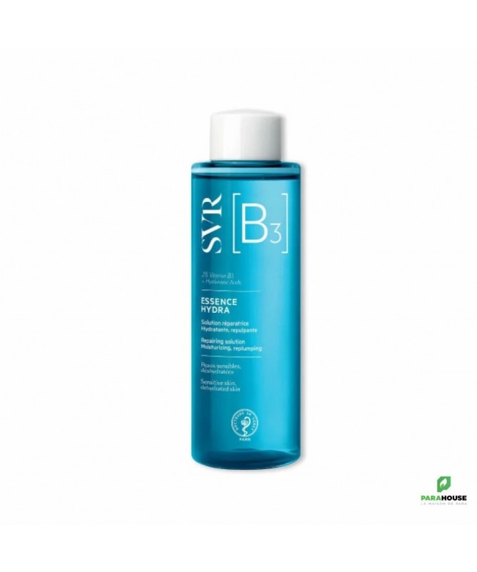 SVR B3 Essence Hydra SVR Essence B3 Hydra 150ML est une lotion destinée aux peaux sensibles et déshydratées. Elle permet de réparer, apaiser et hydrater la peau. L'association de vitamine B3 à un duo d'acides hyaluroniques permet de fortifier, restaurer la barrière cutanée, repulper la peau et atténuer les rides. La texture de ce soin optimise sa pénétration dans la peau. Elle contient 83 % d'ingrédients d'origine naturelle. L'efficacité de ce soin a été mesurée : Après une seule application : la peau est apaisée à 46%, elle est repulpée à 20%, et retrouve son élasticité à 22%. Après 1 mois d’utilisation : les signes de fatigue diminuent à 46% et la ridule visible de la patte d’oie est atténuée à 21%. Composition : Ingrédients : AQUA/WATER/EAU, 1,2-HEXANEDIOL, CAPRYLYL GLYCOL, PROPYLENE GLYCOL, GLYCERIN, DIGLYCERIN, ISOPENTYLDIOL, NIACINAMIDE , SACCHARIDE ISOMERATE, SODIUM HYALURONATE, CITRIC ACID, PENTYLENE GLYCOL, SODIUM CITRATE, SODIUM LACTATE, XANTHAN GUM Non comédogène. Testé sous contrôle dermatologique et sur 100% de peaux sensibles Conseils d’utilisation : Il est conseillé d'appliquer cette essence matin et soir sur une peau bien nettoyée avant le sérum ou la crème. Peaux sensibles, déshydratées, inconforts, rides TESTE PERTUBATEURS ENDOCRINIENS