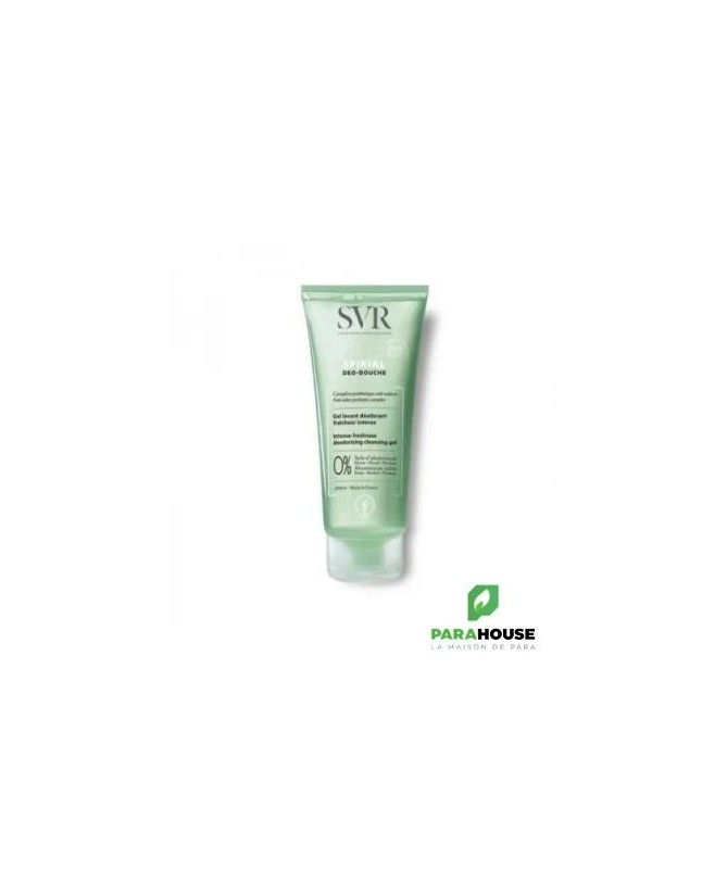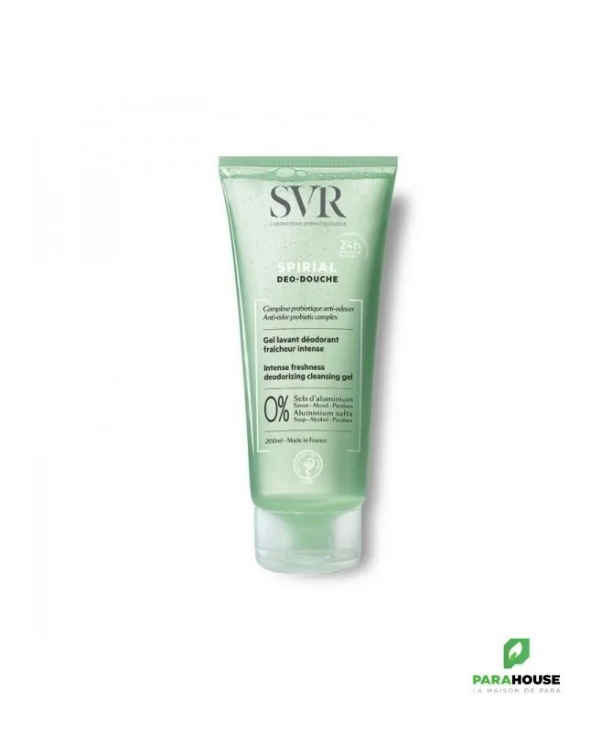SVR SPIRIAL Déo-douche est un gel lavant déodorant fraîcheur intense – efficacité 24 heures, enrichi en agents probiotiques qui offre une protection longue durée contre les mauvaises odeurs. SVR crée SPIRIAL Déo-douche, le 1er gel lavant déodorant fraîcheur intense à l'efficacité 24 heures. Il assainit la peau et laisse une sensation de propre toute la journée. Les agents anti-bactériens contenus dans son complexe probiotique luttent contre les odeurs corporelles tout en maintenant l'équilibre de la flore cutanée. Formulé au pH physiologique, sans savon, sans alcool et sans sels d'aluminium, il est adapté aux peaux sensibles. La peau est fraîche et douce dès la sortie de la douche et les mauvaises odeurs contrôlées tout au long de la journée. Son parfum frais aux notes hespéridés convient aussi bien aux hommes qu'aux femmes. LES ACTIFS DERMATOLOGIQUES - Complexe probiotique : agents anti-bactériens sélectifs qui luttent contre les mauvaises odeurs sans perturber l'équilibre de la flore cutanée - Nettoyant hydratant - apaisant : base lavante douce + dérivé de glycérine pour une peau assainie avec 24h de confort et d'hydratation. HYPOALLERGÉNIQUE - TOLÉRANCE OPTIMALE, Sans savon, sans alcool, sans paraben, sans sels d'aluminium, pH physiologique