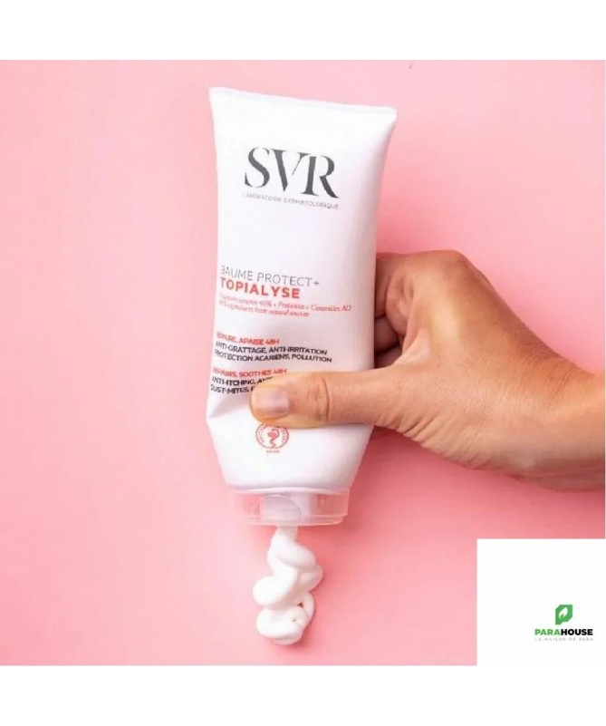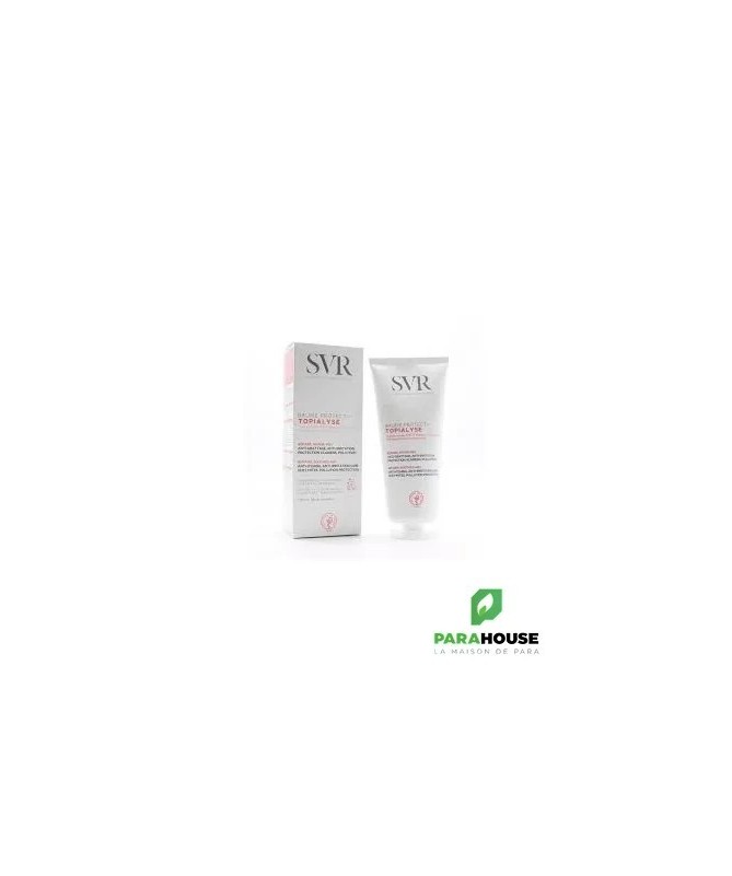 SVR TOPIALYSE BAUME PROTECT+ 200ML SVR TOPIALYSE BAUME PROTECT+ protège toutes les peaux atopiques, irritées par les agressions extérieures (acariens, pollution...), et ne pique pas. Il répare et apaise les irritations lors d'une utilisation régulière. Extrêmement efficace contre les rougeurs et les démangeaisons, le Baume Protect+ est enrichi en Céramides AD(1) brevetées qui apporte une protection face aux agressions extérieures (acariens, pollution…) qui peuvent aggraver les irritations et les crises de grattages. Sa texture nourrissante relipidante fond et laisse un film protecteur à la surface de la peau avec un effet anti-adhésion des microparticules de pollution EFFICACITE IMMEDIATE : 95% la peau est apaisée et confortable(3) EFFICACE PENDANT 48H 48H d’hydratation 91% les irritations ne sont pas réapparues 86% les sensations de démangeaisons et les incitations au grattage sont diminuées Composition : AQUA/WATER/EAU, HELIANTHUS ANNUUS (SUNFLOWER) SEED OIL, COCOS NUCIFERA (COCONUT) OIL, ORBIGNYA OLEIFERA SEED OIL, RICINUS COMMUNIS (CASTOR) SEED OIL, CETEARYL ALCOHOL, HYDROGENATED CASTOR OIL, GLYCERYL STEARATE SE, PENTYLENE GLYCOL, CETEARYL GLUCOSIDE, SODIUM STEAROYL GLUTAMATE, OPHIOPOGON JAPONICUS ROOT EXTRACT, 1,2-HEXANEDIOL, CAPRYLYL GLYCOL, ACRYLATES/C10-30 ALKYL ACRYLATE CROSSPOLYMER, MALTODEXTRIN, PENTAERYTHRITYL TETRA-DI-T-BUTYL HYDROXYHYDROCINNAMATE, GLYCOSPHINGOLIPIDS, CITRIC ACID, GLYCOLIPIDS Non gras et non collant Conseils d'utilisation : Il est conseillé d'appliquer sur l’ensemble du visage et/ou du corps préalablement nettoyé, en insistant sur les zones très sèches. Si l’irritation persiste, veuillez consulter un médecin. A utiliser tous les jours pour éviter les rechutes. Compléter la routine avec TOPIALYSE Baume Lavant ou TOPIALYSE Huile Lavante.