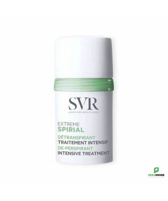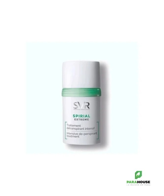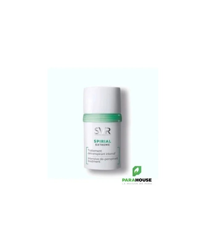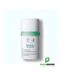 SVR SPIRIAL EXTREME SVR SPIRIAL EXTRÊME possède une formule unique qui régule la transpiration excessive ou extrême tout en respectant les peaux sensibles. Le SVR SPIRIAL EXTRÊME est un traitement détranspirant hautement efficace pour réguler la transpiration et lutter contre les mauvaises odeurs dues à la transpiration, et qui apporte une solution permanente, grâce au pouvoir absorbant des agents sudo-régulateurs de sa formule. Toutes les peaux même les plus sensibles. Transpiration excessive ou extrême. Adolescent à partir de 12 ans (sur avis médical), adulte. Aisselles. Hypoallergénique. Anti traces blanches et jaunes. Composition : INGREDIENTS (CONTAINS) : ALCOHOL DENAT., AQUA (PURIFIED WATER), ALUMINUM CHLORIDE, ALUMINUM SESQUICHLOROHYDRATE, NIACINAMIDE, HYDROXYETHYLCELLULOSE Conseils d'utilisation : Il est conseillé de suivre les étapes suivantes : PHASE D’ATTAQUE : Appliquer pendant 3 jours consécutifs, au choix le matin ou le soir, sur peau propre et sèche. Patienter quelques secondes avant de s’habiller. PHASE D’ENTRETIEN : Ensuite, appliquer 2 à 3 fois par semaine, matin ou soir, selon besoin. Pour ceux qui le souhaitent, il est possible d’utiliser leur déodorant habituel en relais.