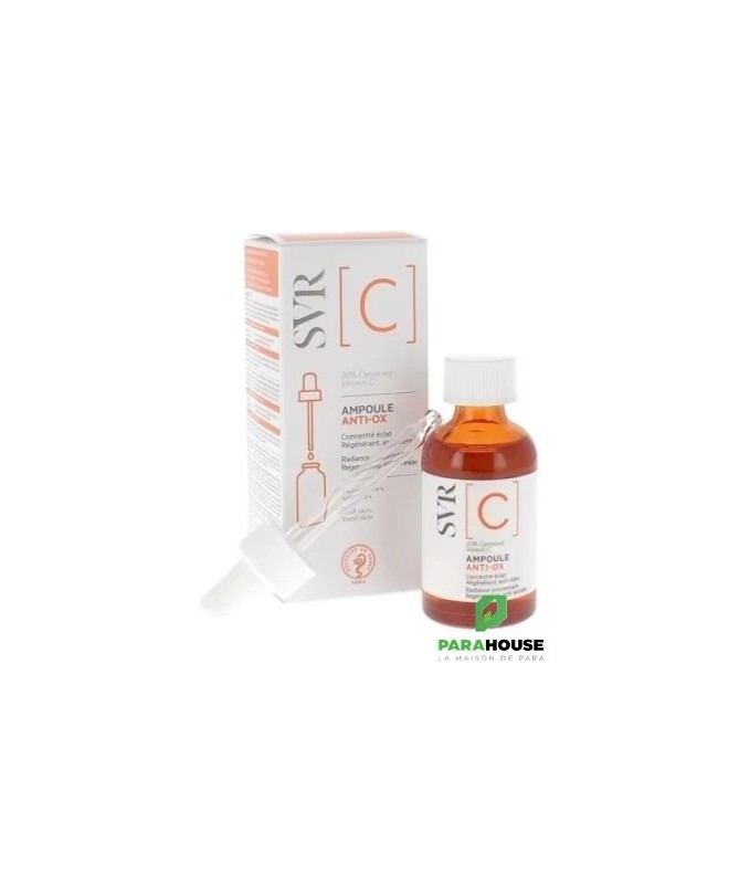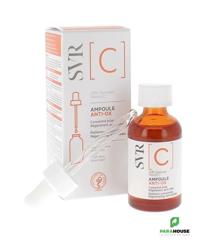 SVR Ampoule C Anti-Ox Concentré Eclat Régénérant Peaux ternes, fatiguées, manque d’uniformité, rides. SVR AMPOULE C ANTI OX avec 20% de Vitamine C optimisée pour une peau éclatante. SVR AMPOULE C ANTI ultra-concentré en vitamine C optimisée recharge immédiatement la peau pour révéler l’éclat du teint et réduire les signes de fatigue. Jour après jour, la peau est en pleine forme : tonique, lumineuse et uniforme La vitamine C, un grand classique mais pas si simple à formuler ! Pure, elle est instable dans le temps, c’est-à-dire qu’elle perd ses propriétés et n’est plus efficace. Vous verrez, cela se voit car elle brunit. Alors comment maximiser son efficacité ? SVR a sélectionné une forme optimisée. 20% de cette Vitamine C optimisée équivaut à 17% de Vitamine C pure. Sa structure proche de la Vitamine C offre les mêmes propriétés que celle pure mais stable et efficace dans le temps. Résultat : vitamine C SVR recharge les batteries de la peau pour un vrai coup de boost et en plus elle se conserve 9 mois après ouverture. Après 28 jours de l'application de svr vitamin c : 90% des peaux fatiguées sont boostées 97% des peaux ternes sont redynamisées Composition : LAB17.11/N.29 – INGREDIENTS (CONTAINS) : AQUA/WATER/EAU, 3-O-ETHYL ASCORBIC ACID, PROPYLENE GLYCOL, ALCOHOL DENAT., GLYCERIN, PROPANEDIOL, ETHOXYDIGLYCOL, PENTYLENE GLYCOL, DIGLYCERIN, XYLITYLGLUCOSIDE, ALGIN, DISODIUM PHOSPHATE, EVODIA RUTAECARPA FRUIT EXTRACT, GLYCERYL POLYACRYLATE, METHYL DIISOPROPYL PROPIONAMIDE, POTASSIUM PHOSPHATE, PULLULAN, SERINE, TREHALOSE, ANHYDROXYLITOL, SODIUM HYALURONATE, UREA, XYLITOL, 1,2-HEXANEDIOL, CAPRYLYL GLYCOL, CITRIC ACID, HYDROXYETHYLCELLULOSE, SODIUM CITRATE, PARFUM (FRAGRANCE) Conseils d'Utilisation: Votre routine sur-mesure en quelques gouttes : appliquez vitamine c svr matin et soir avant votre soin quotidien ou mélangez directement à votre crème. Evitez le contour des yeux.