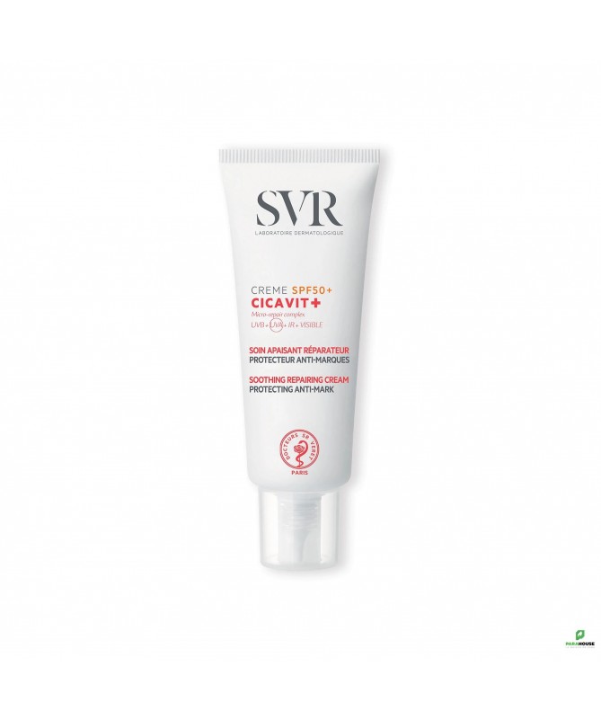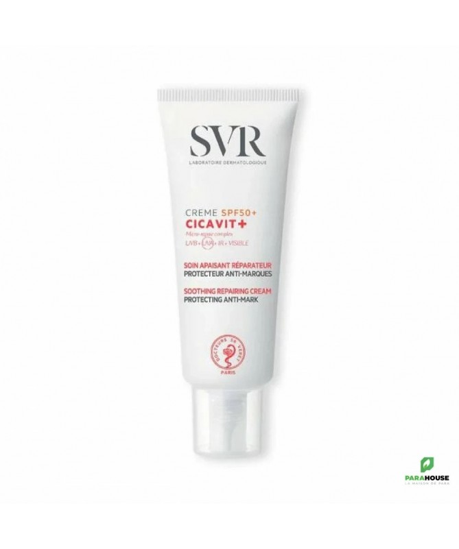 SVR CICAVIT+ Creme SPF50+ 40ML SVR CICAVIT+ Crème SPF50+ est un soin apaisant intense qui accélère la réparation cutanée X7 et cible tous les types de rayons pour limiter les risques de marques rouges et brunes Pour toutes les peaux abîmées et irritées même sensibles, exposées au soleil. Dès la naissance, enfant, adulte. Visage, corps, plis. Cicavit+ crème spf50+ garantit un été sans marques ! Sa texture invisible fusionne avec la peau pour apaiser intensément et accélérer la réparation cutanée X7(1) des peaux abimées et irritées de toute la famille. Formulée avec une technologie filtrante anti-UVA/UVB et un complexe anti-oxydant anti-lumière visible et infrarouges, CICAVIT+ creme SPF 50+ cible tous les types de rayons(2) pour limiter les risques de marques rouges et brunes. Une peau abimée passe par 3 étapes essentielles pour un bon rétablissement : la phase inflammatoire (1 à 3 jours), la phase de réparation (1 à 3 semaines) puis la phase de remodelage (3 à 24 mois). Une exposition au soleil pendant ces phases peut aggraver l’état de la peau et des marques rouges ou brunes peuvent apparaître. Le cœur de formule de SVR CICAVIT Crème SPF50 favorise à la fois chacune des étapes clés de la réparation cutanée tout en protégeant des méfaits du soleil pour restaurer une peau saine et belle. Testée sous contrôle dermatologique et pédiatrique. Hypoallergénique. HAUTE CONCENTRATION EN ACTIFS REPARATEUR ET PHOTOPROTECTEUR POUR UNE EFFICACITE OPTIMALE : Complexe d’actifs réparateurs qui stimule le remodelage de la peau : Accélère la réparation cutanée x7(1) Apaisant & anti-marques Polysaccharide riche en rhamnose : Forme un film protecteur et empêche l’adhésion des bactéries pathogènes à la surface de la peau Réduit rougeurs et échauffements Un sucre prébiotique qui agit sur le microbiome : Restaure l’équilibre de la flore cutanée en stimulant la croissance de la flore bactérienne bénéfique permet d’optimiser le temps et la qualité de réparation de la peau Integral Secure Technology qui cible tous les types de rayons(2) : Un complexe filtrant anti-UVA et UVB Une technologie anti-oxydante anti-lumière visible et infrarouge Composition : LAB18.07/H.14 – INGREDIENTS (CONTAINS) : AQUA/WATER/EAU, DICAPRYLYL CARBONATE, DIETHYLAMINO HYDROXYBENZOYL HEXYL BENZOATE, DIETHYLHEXYL BUTAMIDO TRIAZONE, DIISOPROPYL ADIPATE, SILICA, CETEARYL ALCOHOL, BIS-ETHYLHEXYLOXYPHENOL METHOXYPHENYL TRIAZINE, CETEARETH-20, ETHYLHEXYL TRIAZONE, DIMETHICONE, NIACINAMIDE, POLYMETHYL METHACRYLATE, PENTYLENE GLYCOL, POLYESTER-7, AMINOMETHYL PROPANOL, BETA-CAROTENE, BETA-SITOSTEROL, CETEARYL DIMETHICONE CROSSPOLYMER, DAUCUS CAROTA SATIVA (CARROT) ROOT EXTRACT, GLYCINE SOJA (SOYBEAN) OIL, HYDROGENATED PHOSPHATIDYLCHOLINE, LECITHIN, LEPIDIUM SATIVUM SPROUT EXTRACT, SQUALENE, ALPHA-GLUCAN OLIGOSACCHARIDE, CAFFEYL GLUCOSIDE, DISODIUM ACETYL GLUCOSAMINE PHOSPHATE, GLUCOSE, GLYCERIN, PHYTIC ACID, RHAMNOSE, TOCOPHEROL, TOCOPHERYL ACETATE, 1,2-HEXANEDIOL, CAPRYLIC/CAPRIC TRIGLYCERIDE, CAPRYLYL GLYCOL, CITRIC ACID, GLUCURONIC ACID, HYDROXYETHYL ACRYLATE/SODIUM ACRYLOYLDIMETHYL TAURATE COPOLYMER, LYSOLECITHIN, NEOPENTYL GLYCOL DIHEPTANOATE, POLYSORBATE 60, PROPANEDIOL, SODIUM LAURETH SULFATE, SORBITAN ISOSTEARATE, XANTHAN GUM, POTASSIUM SORBATE, SODIUM BENZOATE Conseils d'utilisation : Il est indiqué d'Appliquer SVR CICAVIT+ Crème SPF 50 généreusement et uniformément avant l’exposition au soleil sur les zones concernées propres et sèches. Renouveler fréquemment l’application pour maintenir la protection, surtout après avoir transpiré, avoir nagé ou s’être essuyé.