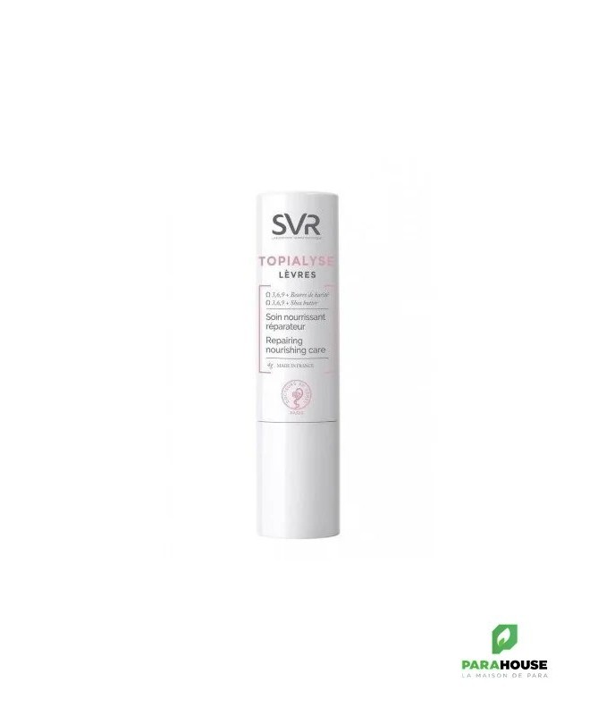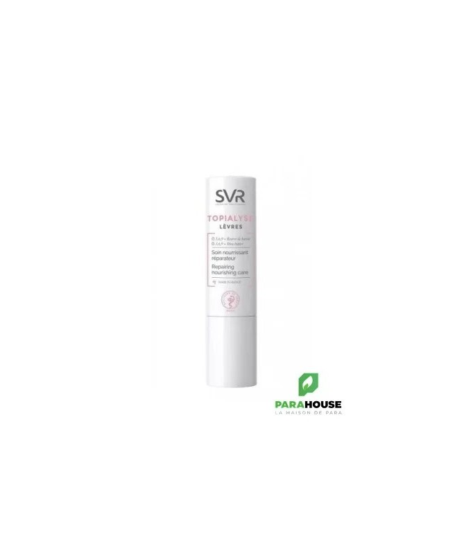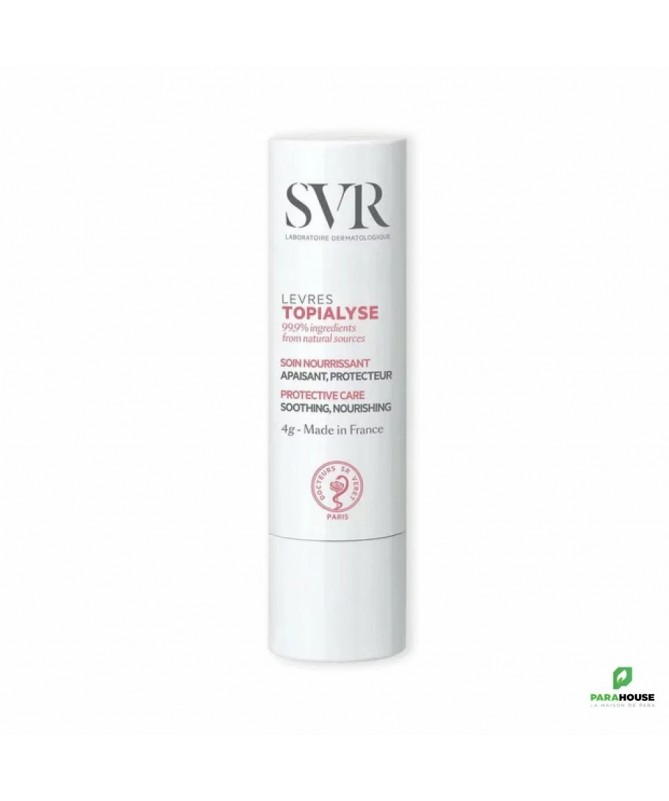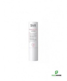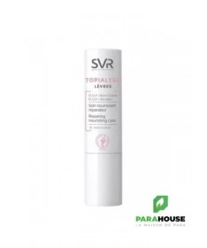 SVR TOPIALYSE STICK LÈVRES 4G Soin nourrissant réparateur SVR TOPIALYSE Levres est formulé pour nourrir et réparer les lèvres abîmées et gercées. Sa formule enrichie protège durablement les lèvres des agressions extérieures. TOPIALYSE Lèvres est spécialement formulé pour nourrir et réparer les lèvres abîmées et gercées. Sa formule enrichie en Omégas 3, 6, 9 protège durablement les lèvres des agressions extérieures quotidiennes. Jour après jour, les lèvres sont apaisées et adoucies. STICK LEVRES SVR est un soin spécialement conçu pour les lèvres sensibles, abîmées et desséchées. Retrouvez un confort longue durée grâce à sa formule haute tolérance enrichie en Oméga 3, 6 et 9. Les lèvres sont réparées, apaisées et hydratées pendant 6h. Sa texture fondante glisse et laisse un film protecteur 100% invisible et non collant qui les protège contre les agressions extérieures. Composition : INCI : LAB16.03/A.02 - INGREDIENTS : PETROLATUM, ISOPROPYL MYRISTATE, GLYCERYL STEARATE, PARAFFINUM LIQUIDUM/MINERAL OIL/HUILE MINERALE, CETYL PALMITATE, BUTYROSPERMUM PARKII (SHEA) BUTTER, SYNTHETIC WAX, TOCOPHERYL ACETATE, CERA ALBA/BEESWAX/CIRE D'ABEILLE, STEARYL STEARATE, CAMELINA SATIVA SEED OIL, STEARYL PALMITATE, PARAFFIN, CETYL STEARATE, BEHENIC ACID, STEARIC ACID, CERA MICROCRISTALLINA/MICROCRYSTALLINE WAX/CIRE MICROCRISTALLINE, ARACHIDIC ACID, PALMITIC ACID, CITRIC ACID, TOCOPHEROL, HELIANTHUS ANNUUS (SUNFLOWER) SEED OIL Conseils d'utilisation: Il est recommandé d'Appliquer sur les lèvres quotidiennement aussi souvent que nécessaire.
